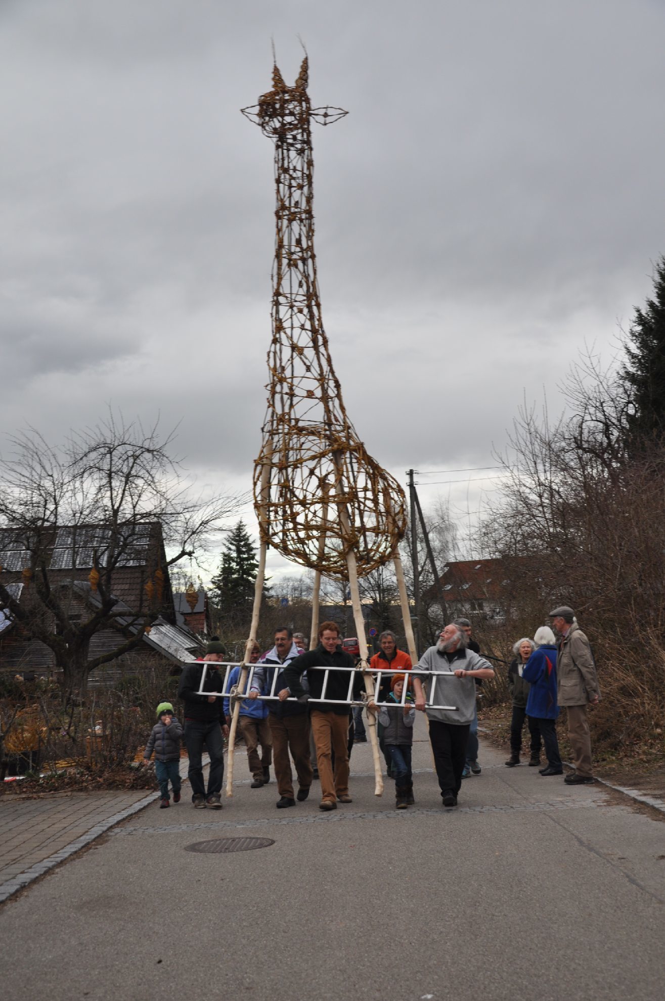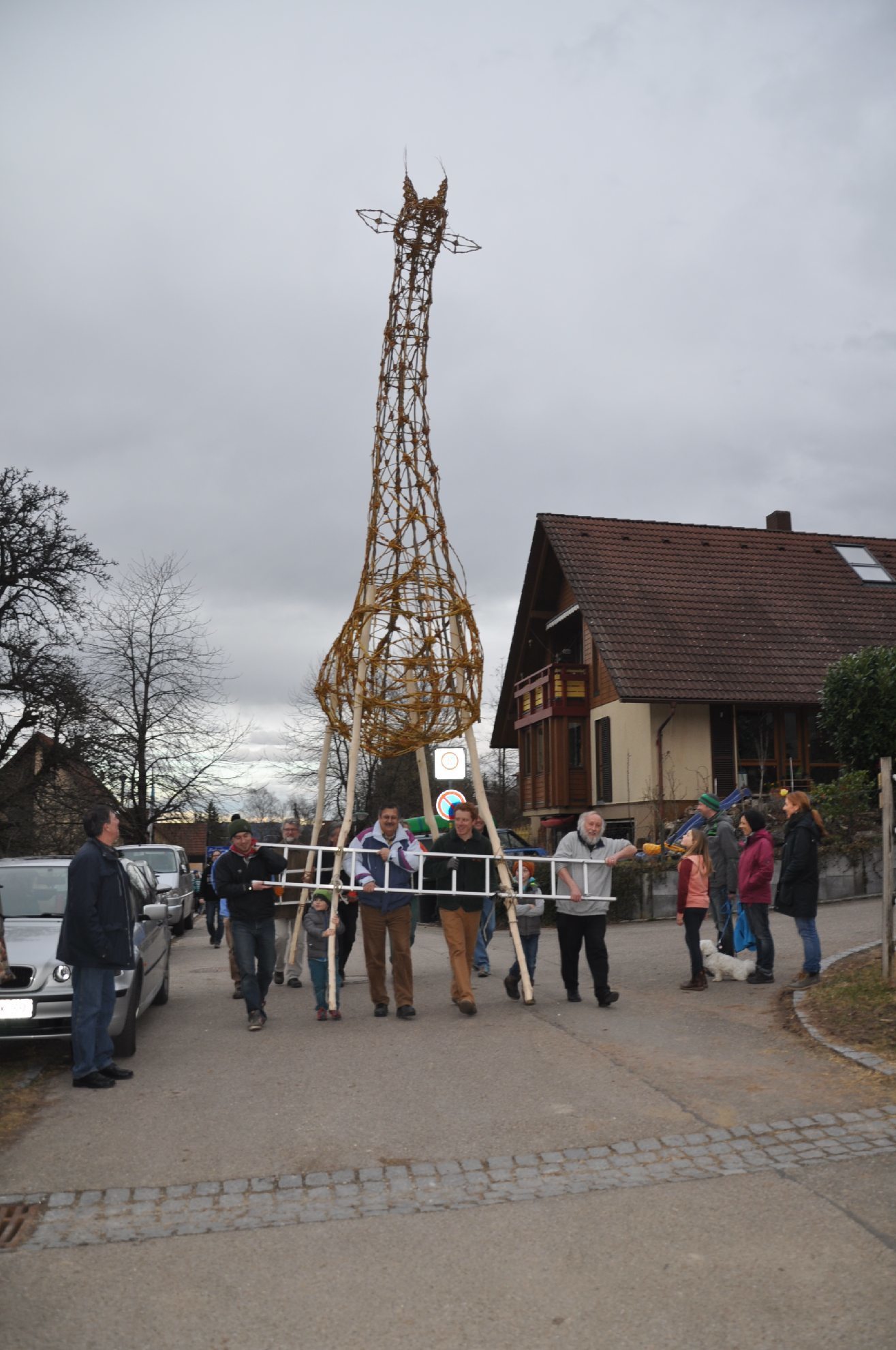 Urheber des gigantischen Tieres ist der Engelberger Naturkünstler David Klopp. Er hat es in wochenlanger Arbeit aus Weiden- und Haselnusszweigen geflochten und mit vier Beinen aus Eschenholz versehen. Mit tatkräftiger Unterstützung der gesamten Nachbarschaft hat Klopp die fertige Giraffe auf eine Wiese am Engelberger Ortsrand getragen (Bilder davon auf www.zvw.de/schorndorf), die ihm die Grundstückseigentümer Anita Sihler und Patrick Traub zur Verfügung gestellt haben. Der Effekt der Verblüffung gehört zum Konzept von David Klopp. „Ich spiele gern mit dem Surrealistischen“, sagt er. Deswegen hat er nicht etwas Gewöhnliches wie ein Pferd gebaut, sondern ein Tier, das in unseren Breiten nicht vorkommt. Dass das Ding so riesig wird, hatte er am Anfang gar nicht geplant. Wie hoch die Giraffe geworden ist, weiß Klopp gar nicht, er schätzt aber, dass es mehr als acht Meter sein müssen.