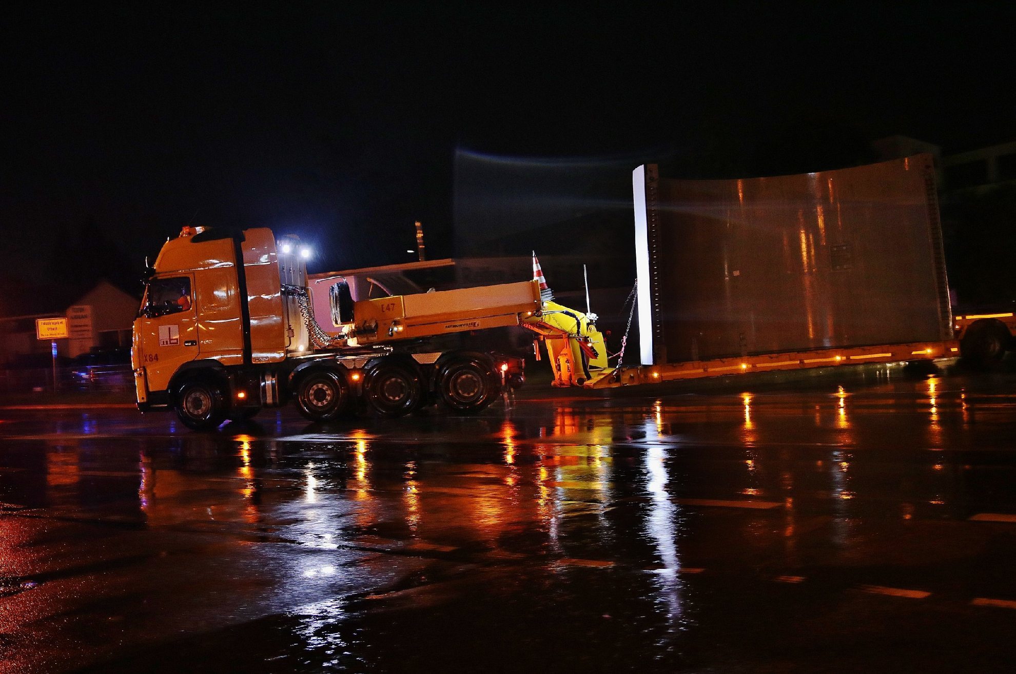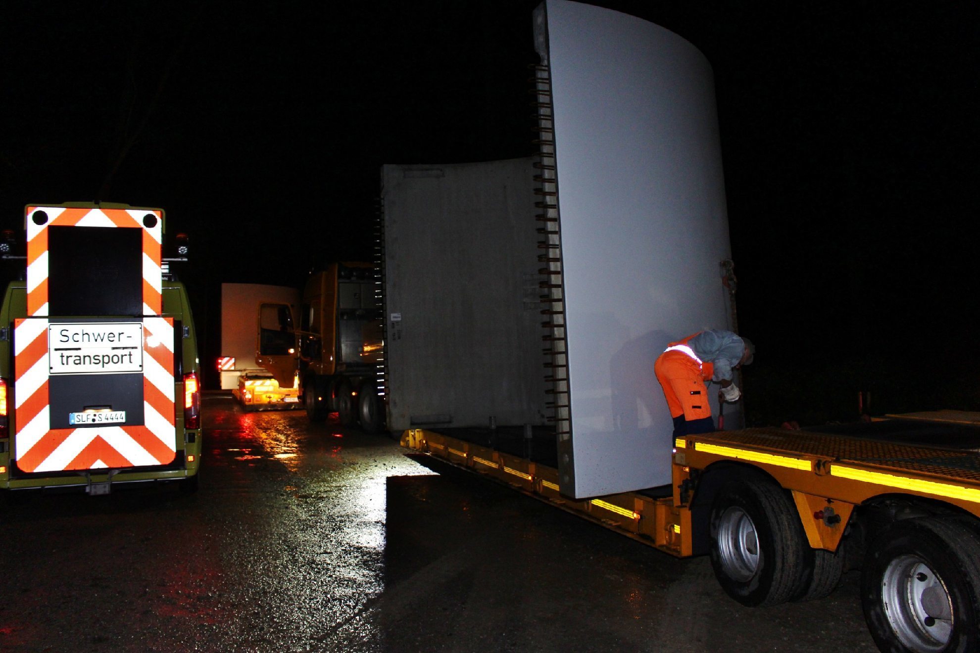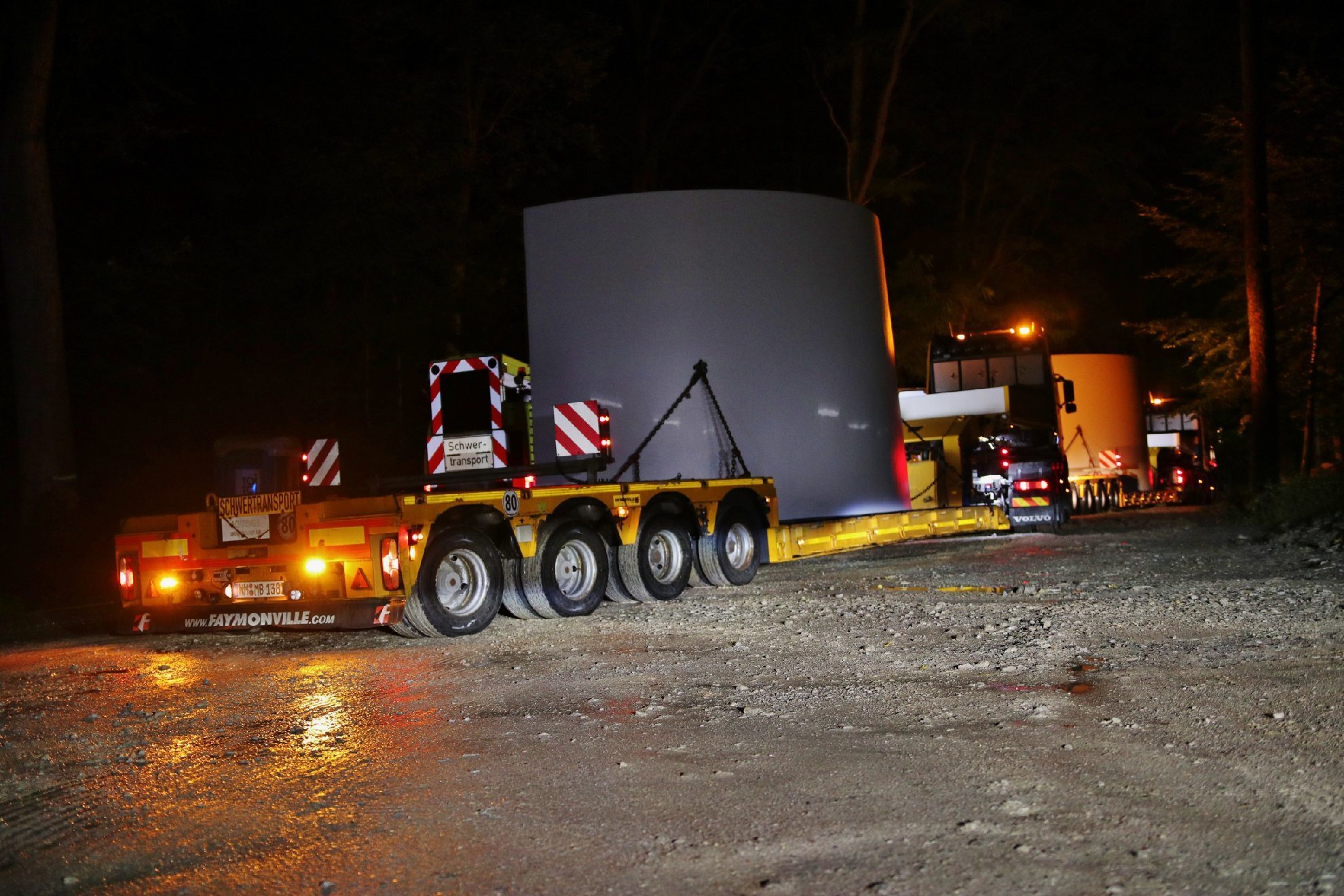 In der Nacht von Mittwoch auf Donnerstag rollte der erste Schwertransport mit Teilen der neuen Windkraftanlage für den Windpark am Goldboden über die B 29 durch Urbach, Schorndorf und Schlichten zum Goldboden.