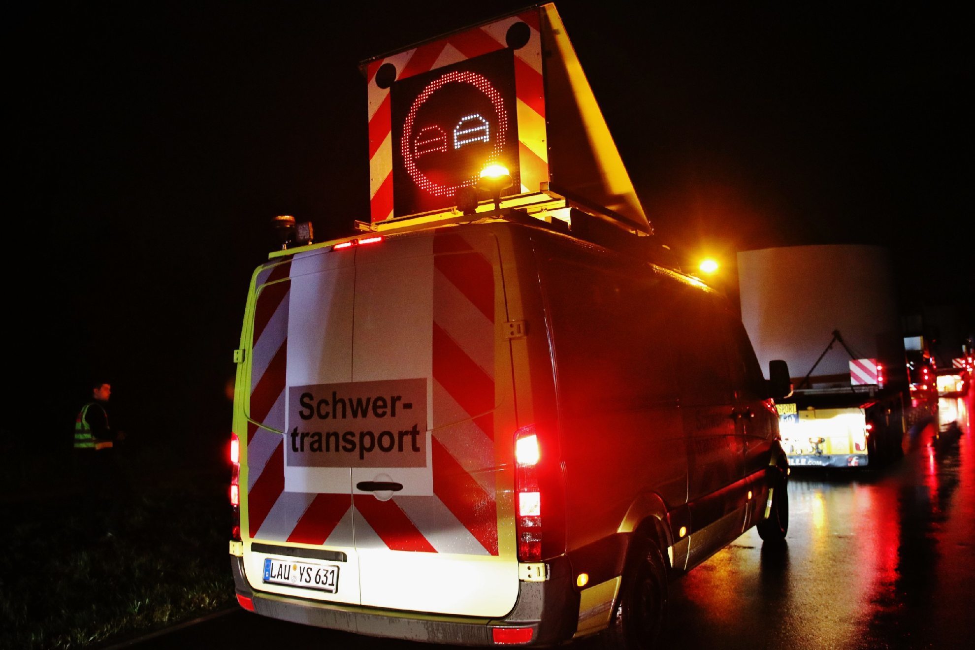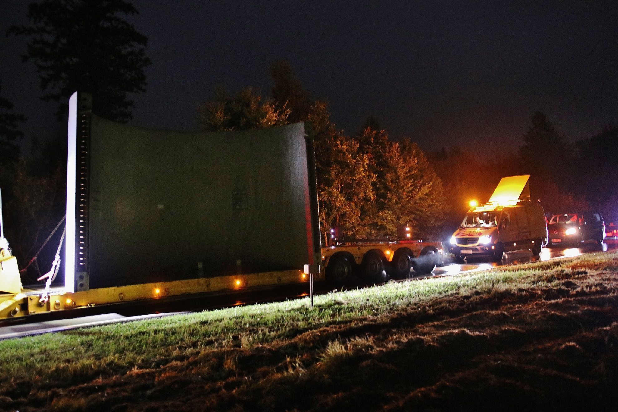 Für den Windpark Goldboden geht Hermann Haas, der Leiter der Koordinationsstelle für Großraum- und Schwertransporte im Polizeipräsidium Aalen, im Schnitt von etwa 15 Transporten pro Windkraftanlage aus. Das macht bei drei Windrädern also 45. Die nächsten sind gleich in der Nacht von Donnerstag auf Freitag unterwegs.