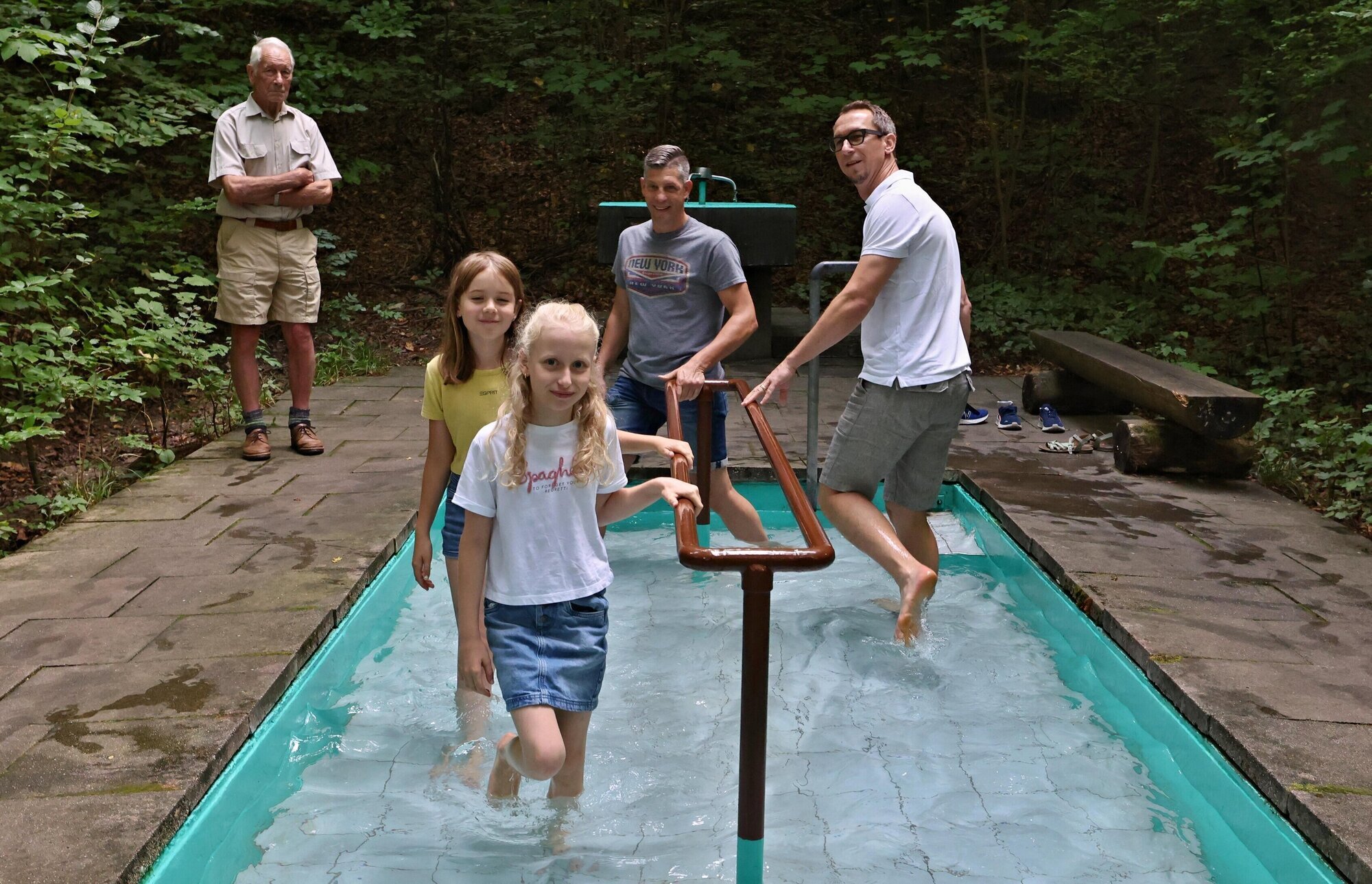 Winterbach. Was für eine Wohltat, bei 30 Grad Sommerhitze im schattigen Wald die Beine ins kalte Wasser zu stecken! Seit 1971 gibt es die Kneippanlage an der Juliusquelle bei Winterbach. Der Weg dorthin führt durch Streuobstwiesen, vorbei am Gartenschau-Monopteros und bietet schöne Aussichten. Gepflegt wird alles von einer Gruppe Ehrenamtlicher. Die Quelle, die die beiden Becken speist, ist nach dem Initiator der Anlage, Julius Klenk benannt. Der brachte den Kneipp-Gedanken