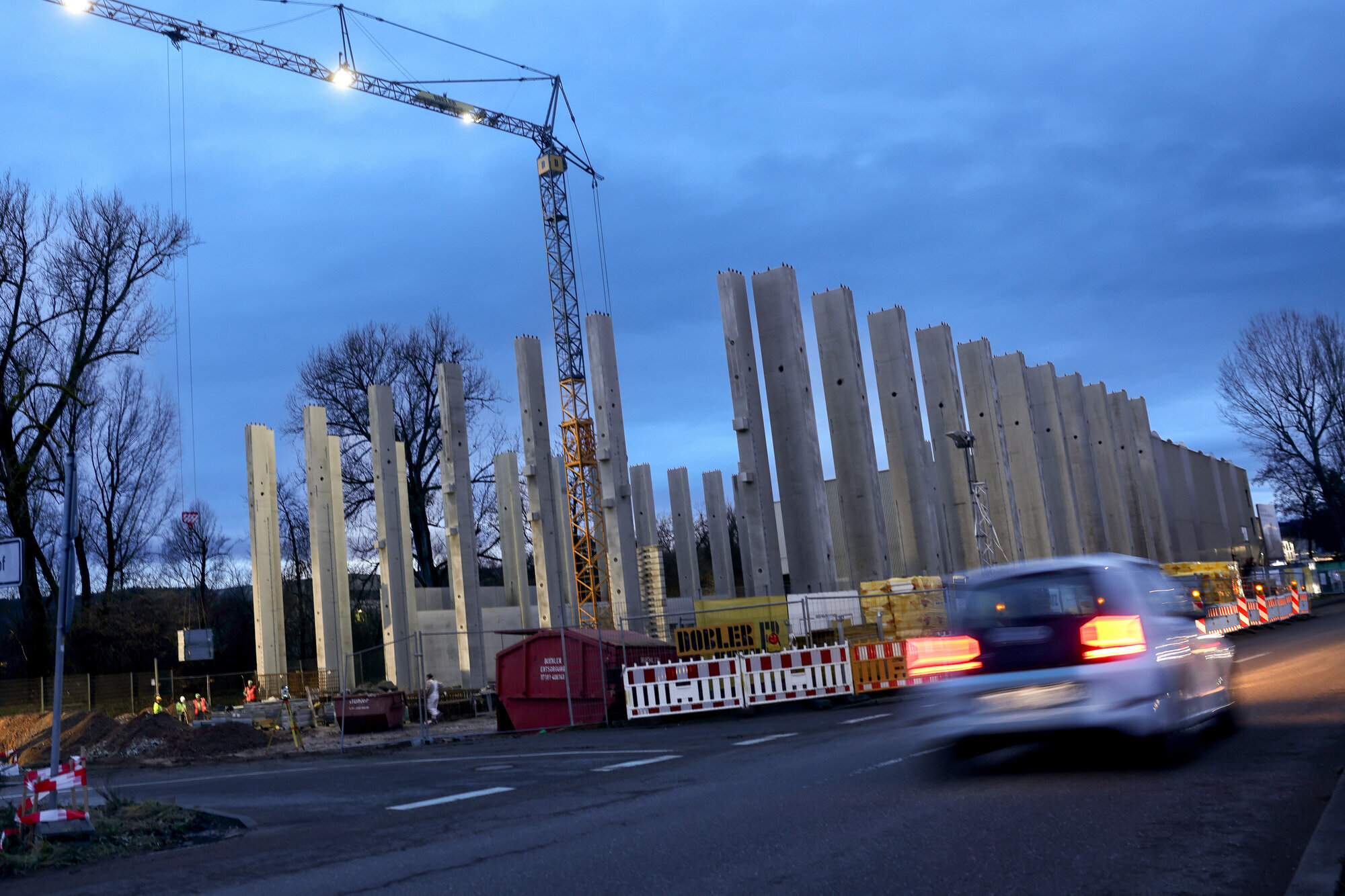 Winterbach. Ein gigantisches Skelett aus Beton entsteht derzeit in Winterbach gut sichtbar von der B29 aus. 32 mächtige Stützen, jede 42 Tonnen schwer, ragen dort bereits 14,50 Meter hoch auf. Dabei ist das noch nicht mal die Hälfte der Höhe, die der Neubau von Pfisterer einmal haben soll. Mit etwa 31.30 Meter wird die Halle in etwa so hoch sein wie das Gebäude von Beutelsbacher Fruchtsäfte in Weinstadt. Im Inneren werden später große Hochspannungsprüfsysteme stehen, aber