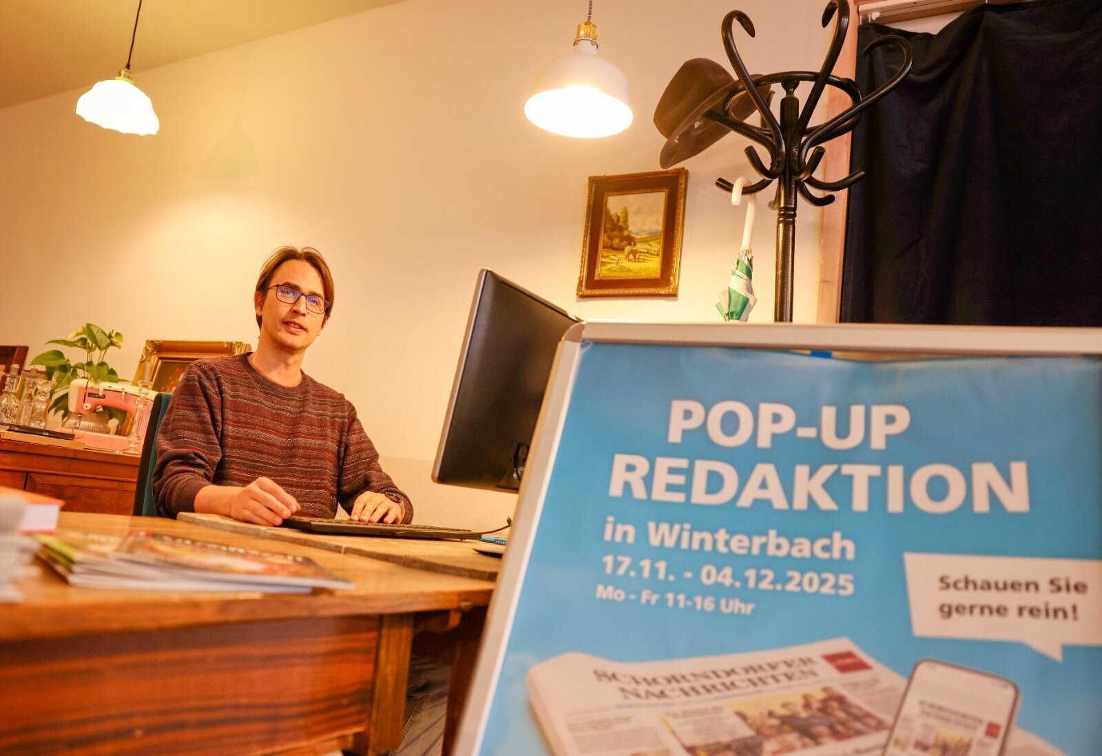 Winterbach. Seit Montag 17. November sind wir mit unserer Pop-Up-Redaktion in Winterbach in der Westergasse 6 im Café Alte Glaserei. Und es hat sich jetzt schon gelohnt: Einige Winterbacherinnen und Winterbacher haben die Gelegenheit genutzt und sind mit spannenden und relevanten Themen zu uns gekommen. Daraus werden in den nächsten Tagen und Wochen Artikel entstehen: etwa über eine große Baustelle an zentraler Stelle im Ort, den Geburtstag einer bekannten Winterbacherin und