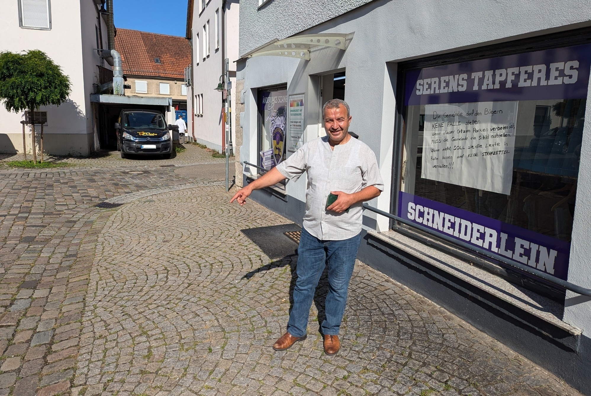 Das Plakat hängt im Schaufenster der Änderungsschneiderei in Winterbach zwischen der Aufschrift „Serens tapferes Schneiderlein“, die oben und unten angeklebt ist. Der handgeschriebene Text darauf endet mit drei Ausrufezeichen und beginnt mit einer Forderung: „Die Gemeinde darf den Bürgern keine Falle stellen.“ Hier macht jemand seinem Ärger Luft. Worum geht es? Schneider Ilhan Seren kommt aus seinem Laden und erklärt sich. Die „Falle“ ist für ihn die Fläche direkt vor seiner Tür. Die