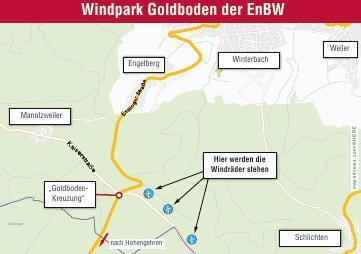 - Die EnBW baut am Goldboden drei Windräder, inklusive Rotorblättern jeweils mit einer Gesamthöhe von rund 230 Metern. Schon im September 2017 sollen sie sich drehen und Strom liefern.