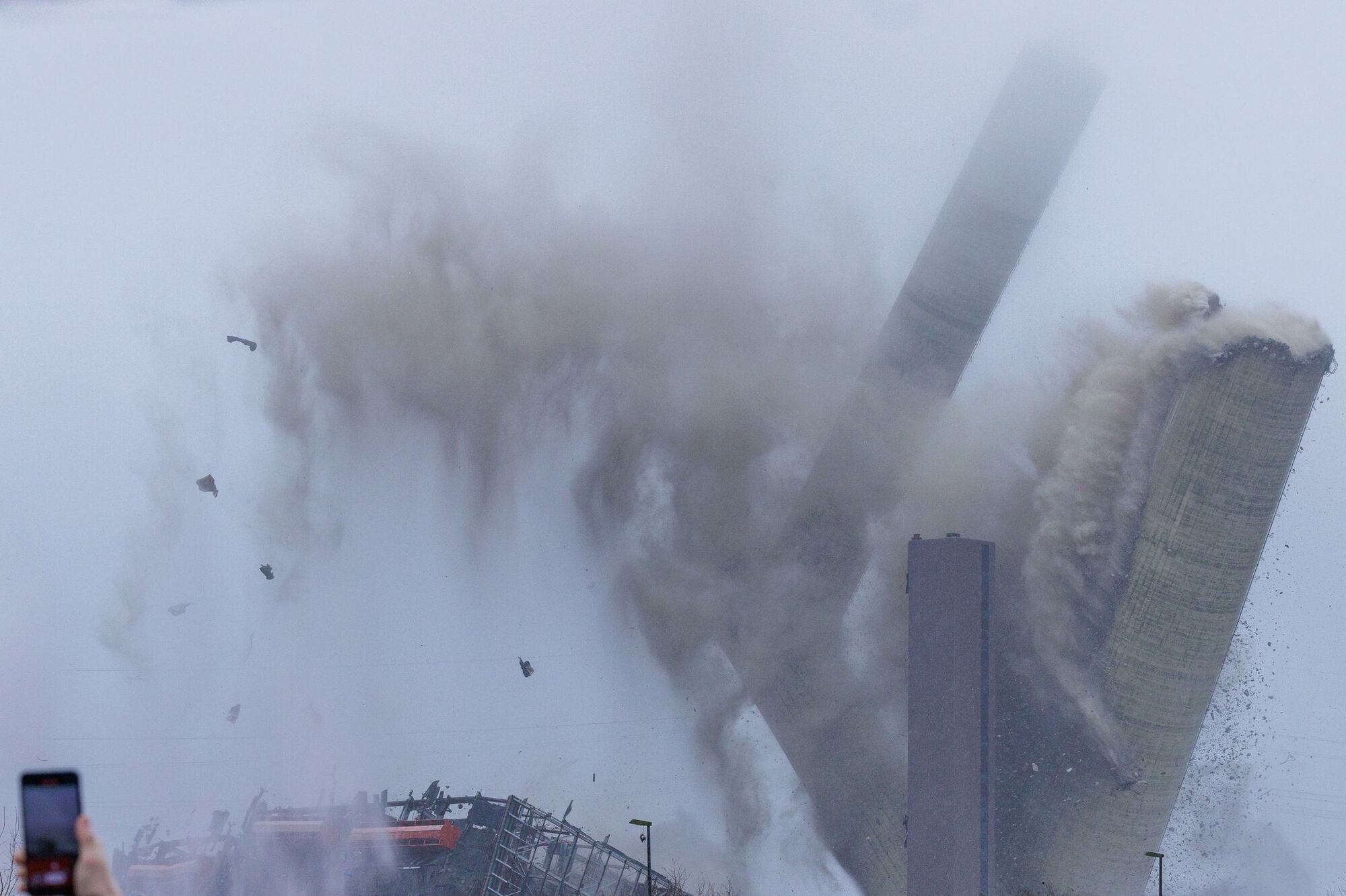 Ibbenbüren (dpa) - Ein lauter Knall und viel Staub: In Ibbenbüren im nördlichen Westfalen ist der 275 Meter hohe Schornstein des ehemaligen Steinkohlekraftwerks gesprengt worden. Die zahlreichen Schaulustigen konnten allerdings nur einen Teil des Spektakels sehen, denn die obere Hälfte des Schornsteins war von Nebel und Wolken verdeckt. Mit der Sprengung ist die letzte bis Niedersachsen zu sehende Landmarke des früheren RWE-Kraftwerks verschwunden.