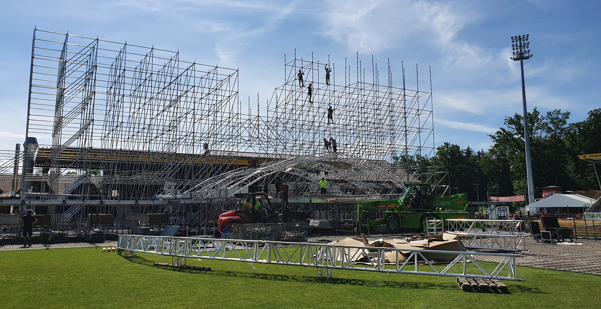 Mittendrin in der heißen Aufbauphase: Wie Bergsteiger hängen die behelmten und angegurteten Gerüstbauer zwischen den Metallstangen. Stange für Stange findet eine nach der anderen den Weg durch mehrere Hände nach ganz oben. Das Klopfen auf Metall hallt durch das Stadionrund im Aspacher Fautenhau, ergänzt von dem Gehämmer auf Holz, denn auch die Fan-Buden, Essens- und Getränkestände werden platziert. Vom 15. bis 17. Juli steigt das 15. Heimspiel von Sängerin Andrea Berg in der