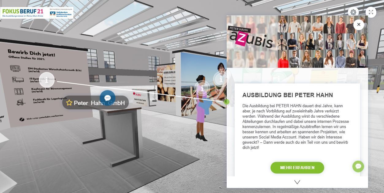 Fast wie auf der richtigen „Fokus Beruf“. Man schlendert durch die Hallen, schaut, neugierig geworden, an einem Stand vorbei, verweilt bei dem einen Aussteller länger - und lässt den anderen schnöde links liegen. Was bei dem virtuellen Messebummel definitiv fehlt, ist das Gewusel und Gedrängel, die messetypische Geräuschkulisse - und die schmerzende Schulter, auf die die mit Prospekten prallvoll gefüllte Tasche bleischwer drückt.