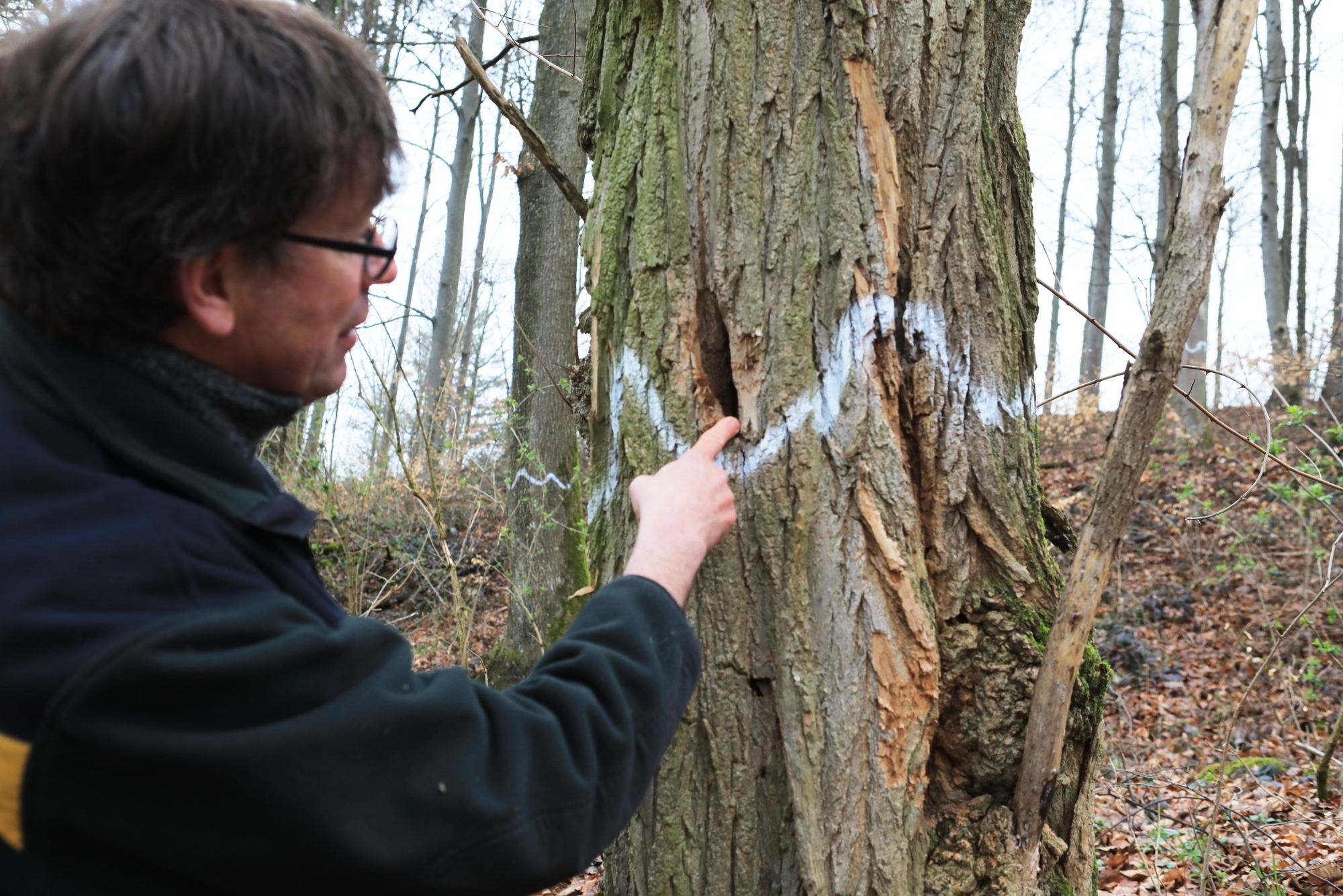 Die weiße Welle ist ein Kennzeichen, das dem Waldfachmann signalisiert: Finger weg! Bäume mit der weißen Welle sind Teil von kleinen Naturschutz-Inseln, die zum Alt- und Totholzkonzept gehören.