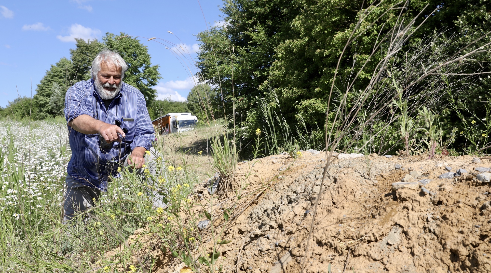 so mit dem Auto vorbeifährt. Gerne würde man einen längeren Blick drauf werfen. Geht aber nicht. Ist unbegehbares Gebiet. Die betreuenden Biologen Karin und Martin Weiß allerdings schauen sich Stufenpyramiden und Blühflächen immer wieder genau an.