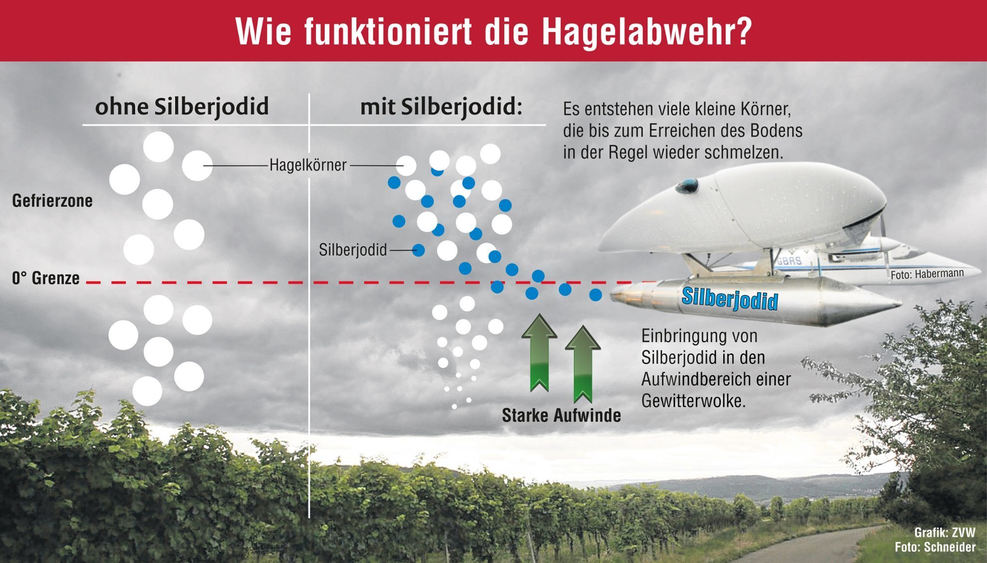 Mit diesen markigen Worten meint er unter anderen den Rems-Murr-Kreis. Seit 1980 ist der Landkreis aktiv und federführend im Bündnis Hagelflieger, neben Stuttgart, Heilbronn, Esslingen und Ludwigsburg. Mittlerweile drei Hagelflieger stehen parat, um bei drohenden Hagelniederschlägen aufzusteigen und Silberjodid-Partikel unter der Wolkenbasis zu streuen. Durch Aufwinde werden die feinen Partikel direkt in die Gewitterwolken transportiert. Die Prozedur soll den Hagel nicht verhindern, vielmehr wird die Wolke mit künstlichen Kristallisationskernen befruchtet, damit sich noch viel mehr, aber auch viel kleinere Hagelkörner bilden. Denn viele kleine Hagelkörner richten bei weiten nicht so viel Schaden an wie wenige große.