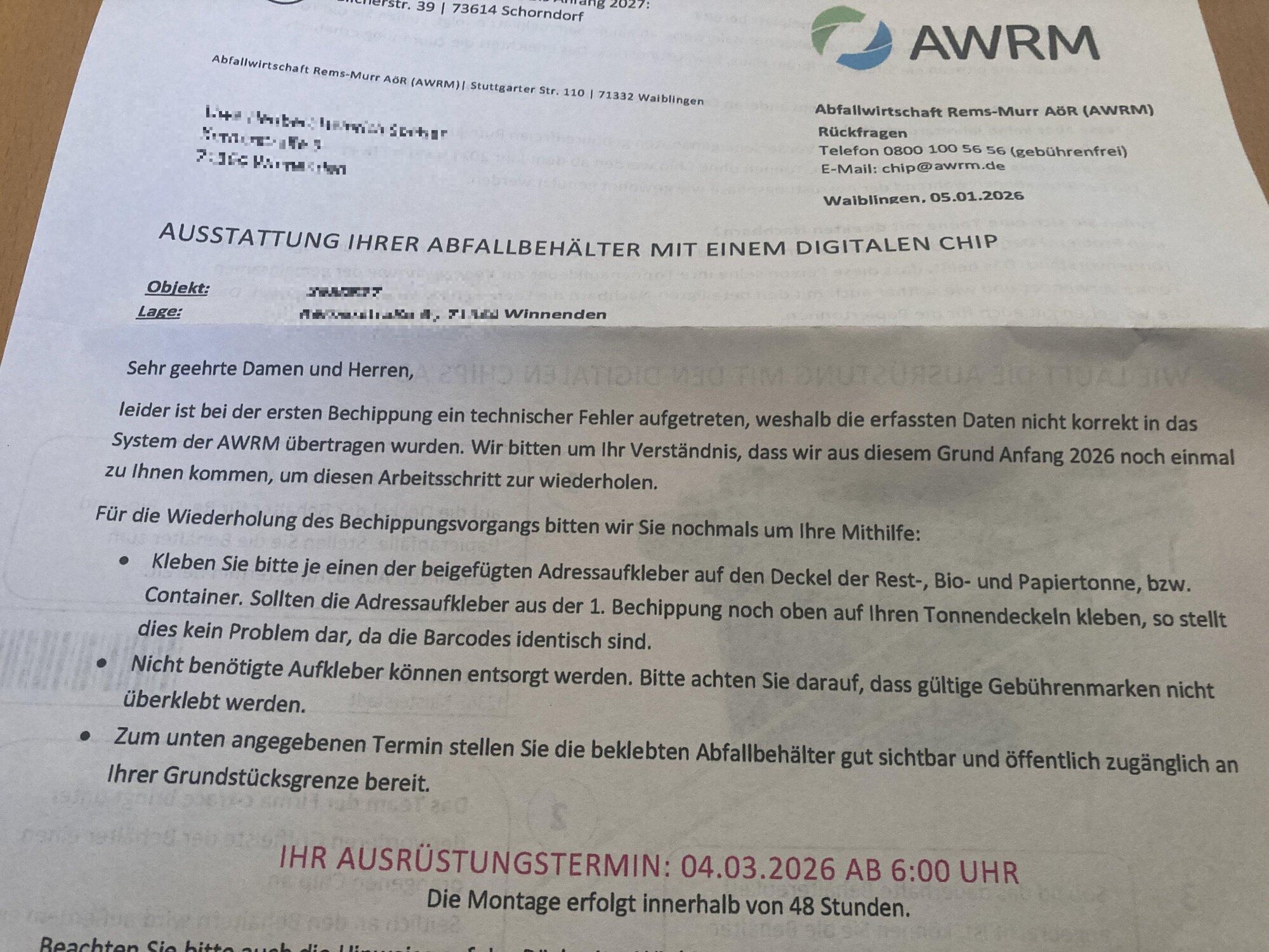 Rems-Murr-Kreis. Leichte Verwirrung, gelinde Verärgerung bei Betroffenen: Die AWRM hat in mehreren Gemeinden im Rems-Murr-Kreis darüber informiert, dass im Zusammenhang mit der Bechippung der Mülltonnen nochmals nachgearbeitet werden wird. Ein technischer Fehler muss ausgebügelt werden. Warum jetzt genau? Was muss gemacht werden? Und wie viel Geld wird dafür fließen?