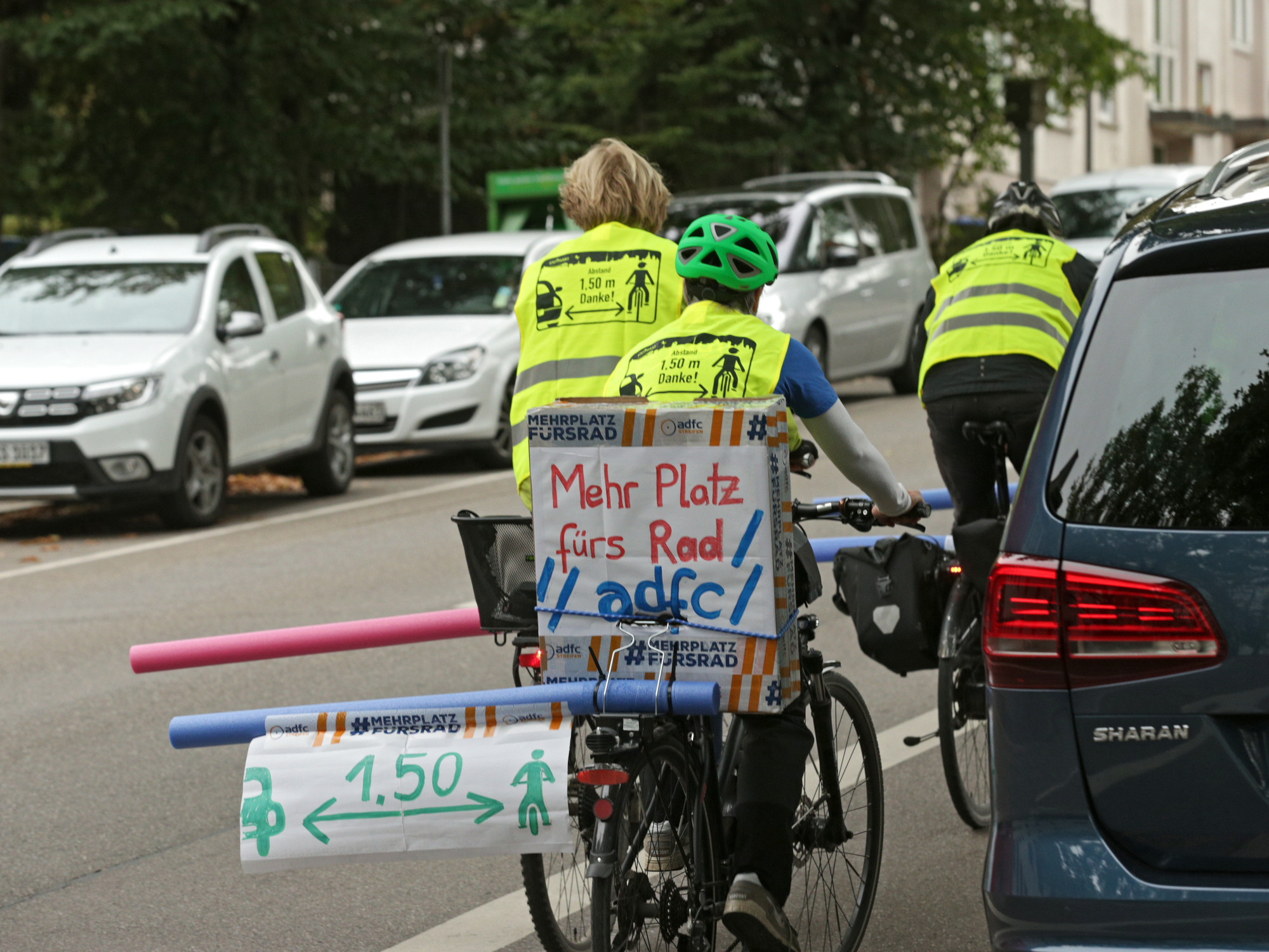 ADFC-Aktion „Mehr Platz fürs Rad!“ in Waiblingen. Mit „Pool-Nudeln“ machten Radfahrer deutlich, in welchem Abstand Autos Radfahrer überholen müssen. © Ralph Steinemann Pressefoto