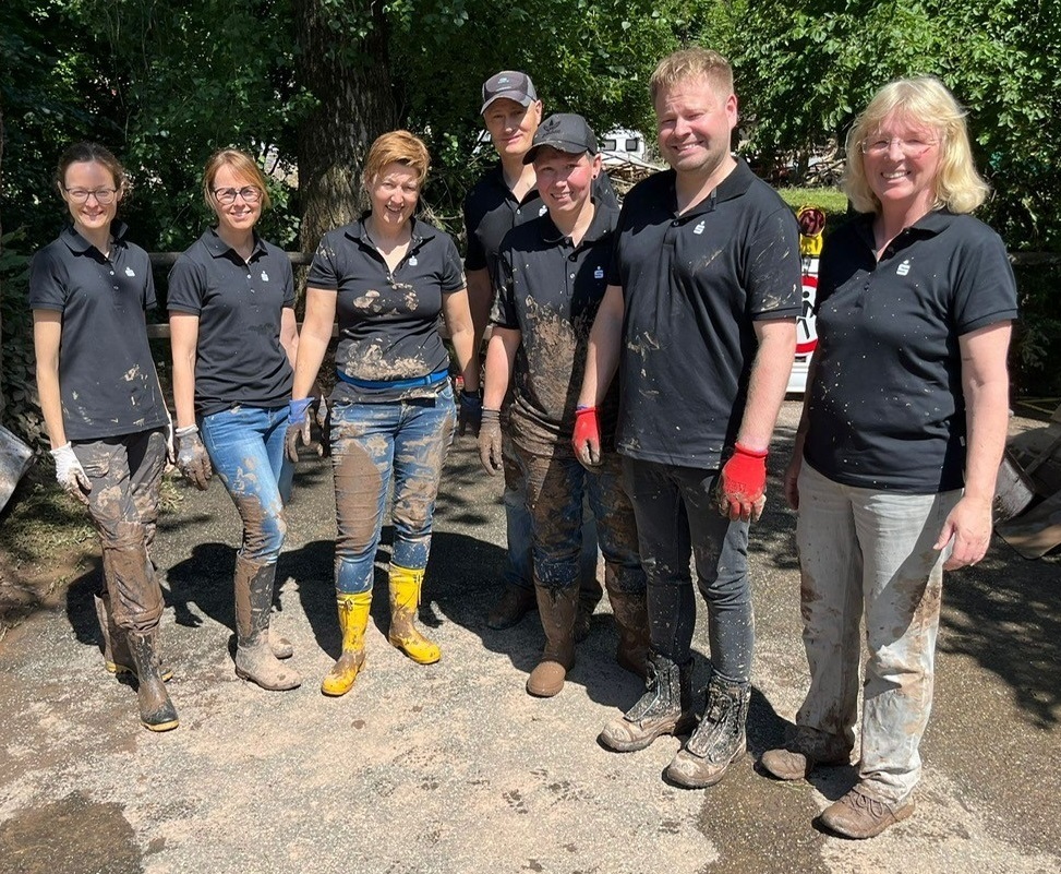 Hervorzuheben sind auch das Engagement und die Unterstützung der Sparkassen-beschäftigten vor Ort. Möglich gemacht wurde dies durch den Social Day, den die Kreissparkasse Waiblingen im Rahmen ihres 50-jährigen Fusionsjubiläums allen Mitarbeitenden im Jahr 2024 gewährt. Ursprünglich für den Einsatz in sozialen Einrichtungen, Vereinen usw. gedacht, hat die Kreissparkasse kurzerhand entschieden, dass der Social Day 2024 auch für die akute Hochwasserhilfe genutzt werden kann.