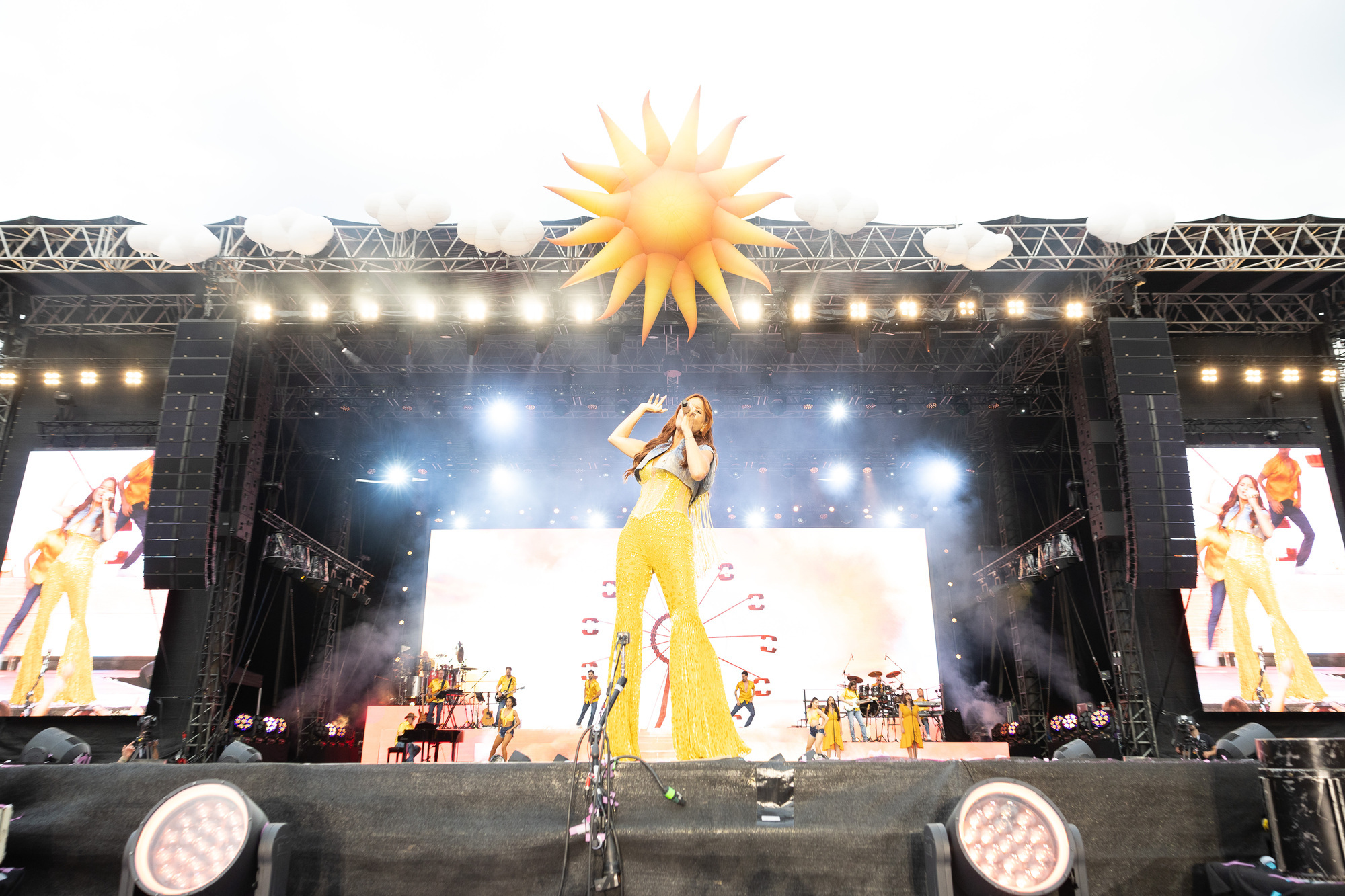 Ausnahmezustand im Fautenhau: Sängerin Andrea Berg hat an diesem Wochenende zu ihrem 17. Heimspiel eingeladen. Der Heimspiel-Auftakt am Freitag wurde zur Sommerparty inklusive besten Wetters und mit mehr als 15 000 singenden, feiernden und tanzenden Fans vor einer großen Bühne und mit einer energiegeladenen Musikerin, die in ihrem „großen Wohnzimmer“, der Arena in ihrer Wahlheimat Aspach, ihre Fans begrüßte. Zu Beginn trägt die Sängerin einen gelb-glitzernden Schlaghosenanzug mit einer