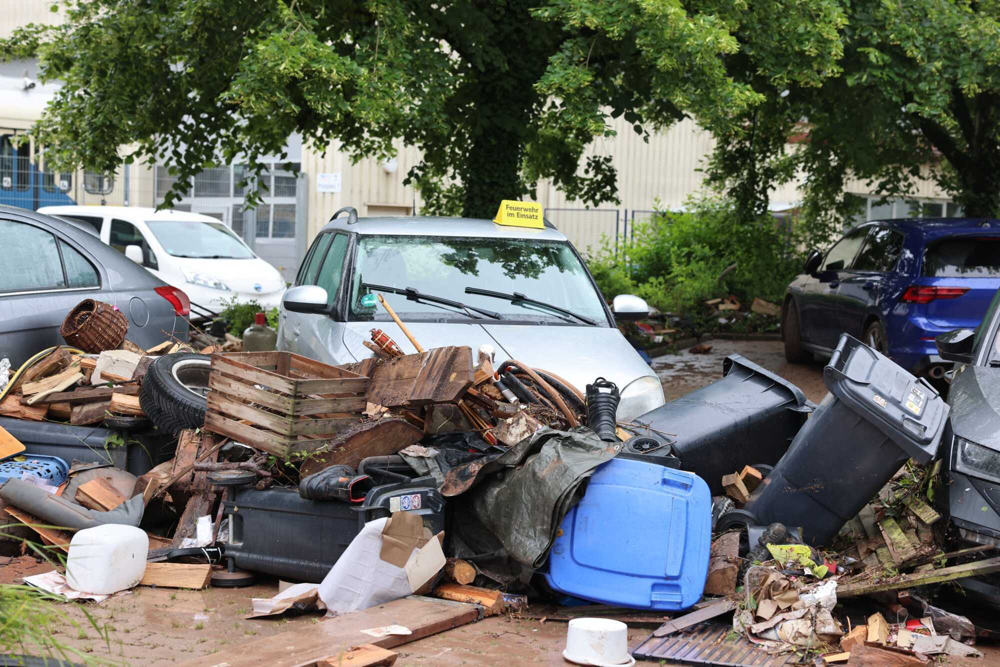 Auf dem Parkplatz der Firma Weru findet Gabriel zusammengespülte Autos und Container vor.