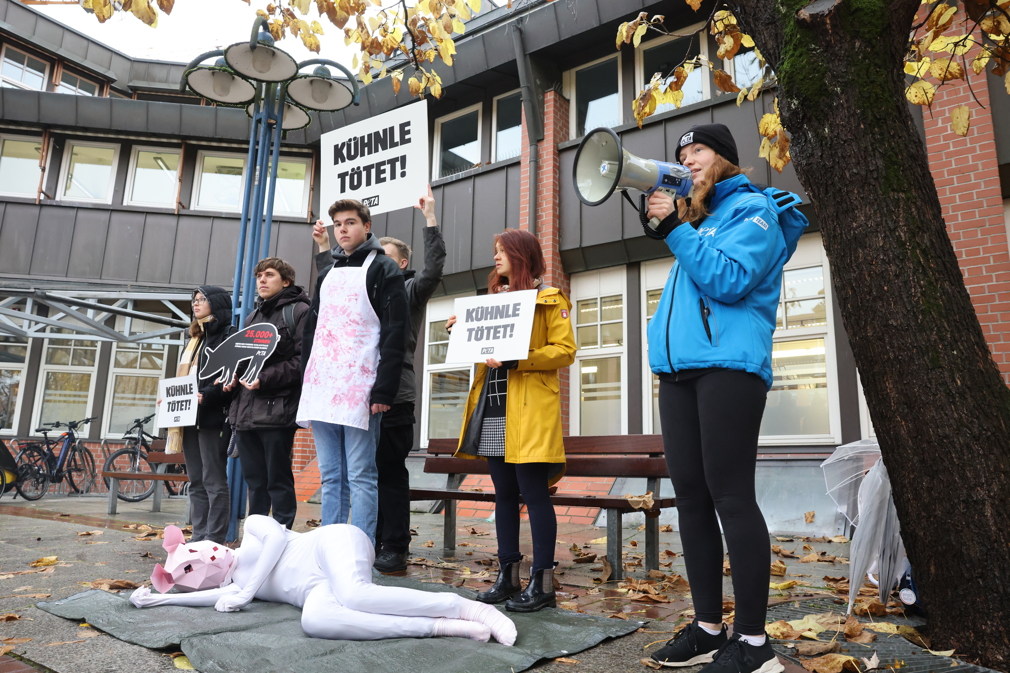 „Blutige Hände“ und einen „blutbeschmierten Aktivisten“ hatte die Tierschutzorganisation Peta angekündigt: Es geht um die Wiedereröffnung des Backnanger Schlachthauses Kühnle. Rund 26.000 Unterschriften gegen selbige haben die Aktivisten gesammelt und wollten sie Landrat Richard Sigel übergeben. Der allerdings ließ sich nicht blicken. Und auch kein Stellvertreter.