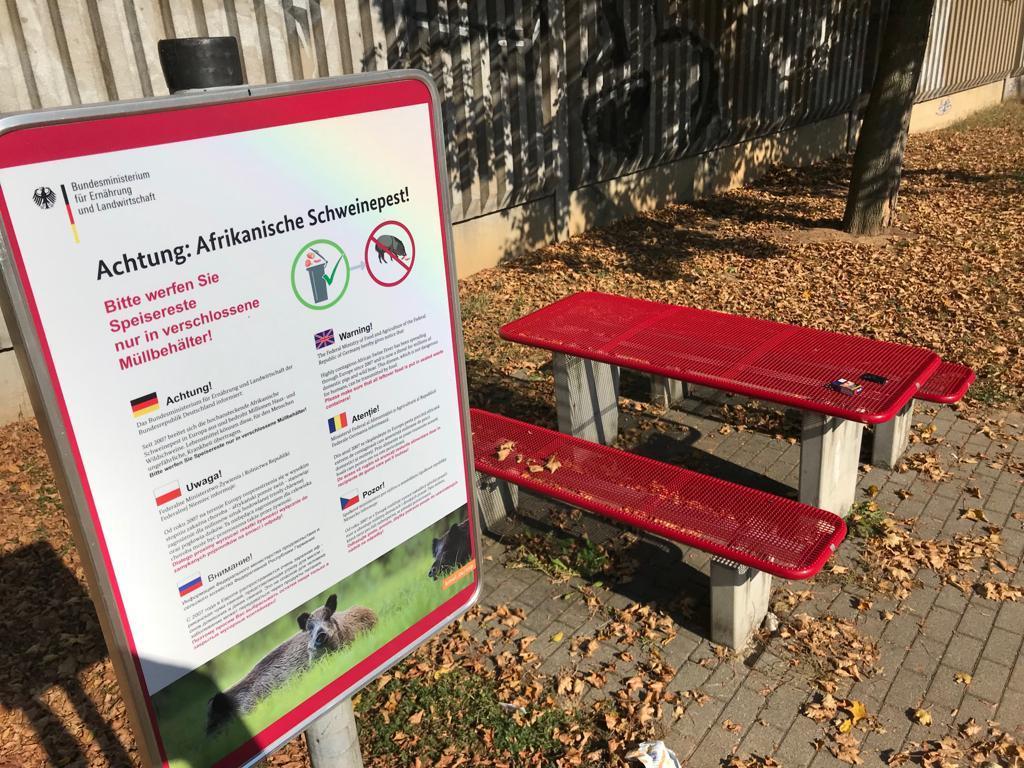 Weinstadt/B29. Auf einem Parkplatz an der B29 auf Höhe Weinstadt-Endersbach stehen seit kurzem Schilder, die auf die Gefahr durch die Afrikanische Schweinepest hinweisen. Man solle Essensreste nur in verschlossene Müllbehälter werfen, heißt es darauf. Fälle der Afrikanischen Schweinepest gibt es in Deutschland bislang nicht, jedoch wurden die Viren in den angrenzenden Ländern in Ost und West nachgewiesen.