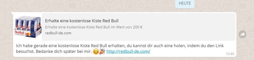 Die Nachrichten enthalten Gewinnversprechen wie "Erhalte kostenlos eine Kiste Red Bull" und eine Internetadresse, die der Originaladresse durchaus ähnelt, aber im Detail dann doch abweicht. Wie beispielsweise redbull-de.com anstatt der eigentlichen URL redbull.com/de-de/.