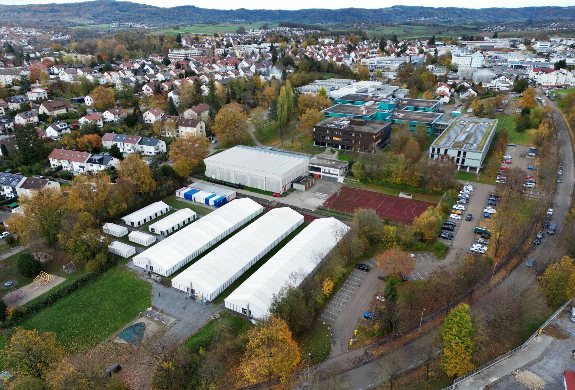 Zeltunterkunft für über 300 Flüchtlinge in Backnang - Landkreis versucht Sport- und Versammlungshallen zu entlasten - Luftbilder