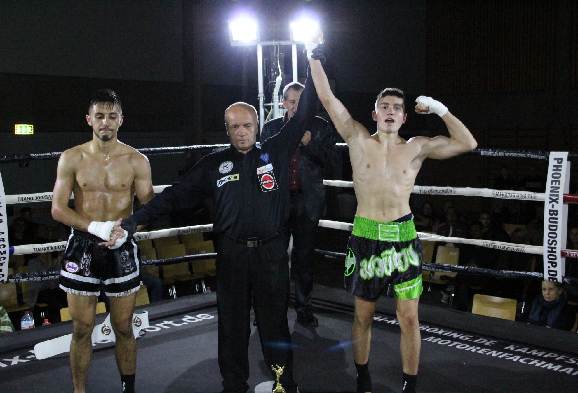 Die Kontrahenten kommen. Zunächst Semih Mese vom KA Trier, „In the Air tonight“ von Phil Collins plärrt aus den Boxen. Der erste Eindruck: Das wird schwer für Kurz. Mese, der ebenfalls schon Medaillen bei Weltmeisterschaften gewonnen hat, ist durchtrainiert, sein Gesicht eine Maske der Konzentration. Behände klettert er in den Ring, tänzelt und lässt sein Fransenhöschen flattern. Der Applaus ist sehr freundlich, doch Sekunden später bricht ein Beifallssturm los: Zu Bumm-Tschack-Musik betritt Johannes Kurz die Halle, begleitet von seinem Trainer und väterlichen Freund De Mitri. Der zigfache Weltmeister wirkt angespannt, sein Schützling bis zum Äußersten entschlossen. Im Ring legt Kurz den Umhang ab. Der erste Eindruck: Das wird schwer für Mese. Auch hier kein Gramm Fett, dazu wirkt der DMG-Kämpfer so selbstsicher und in sich ruhend, dass man sofort vergisst, dass er erst 16 ist.