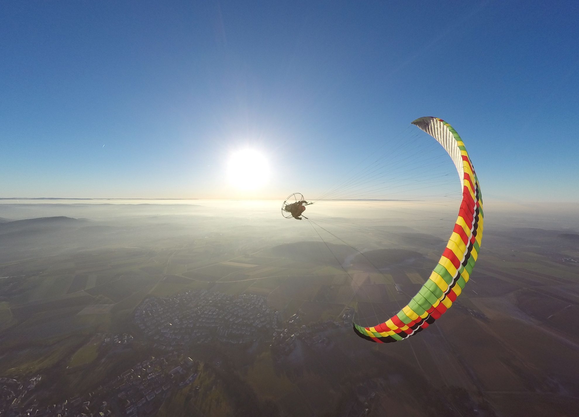 So malerisch kann ein Flug mit dem Motorschirm sein. Der Rudersberger Benedikt Bös fliegt der Sonne entgegen. © Benedikt Bös