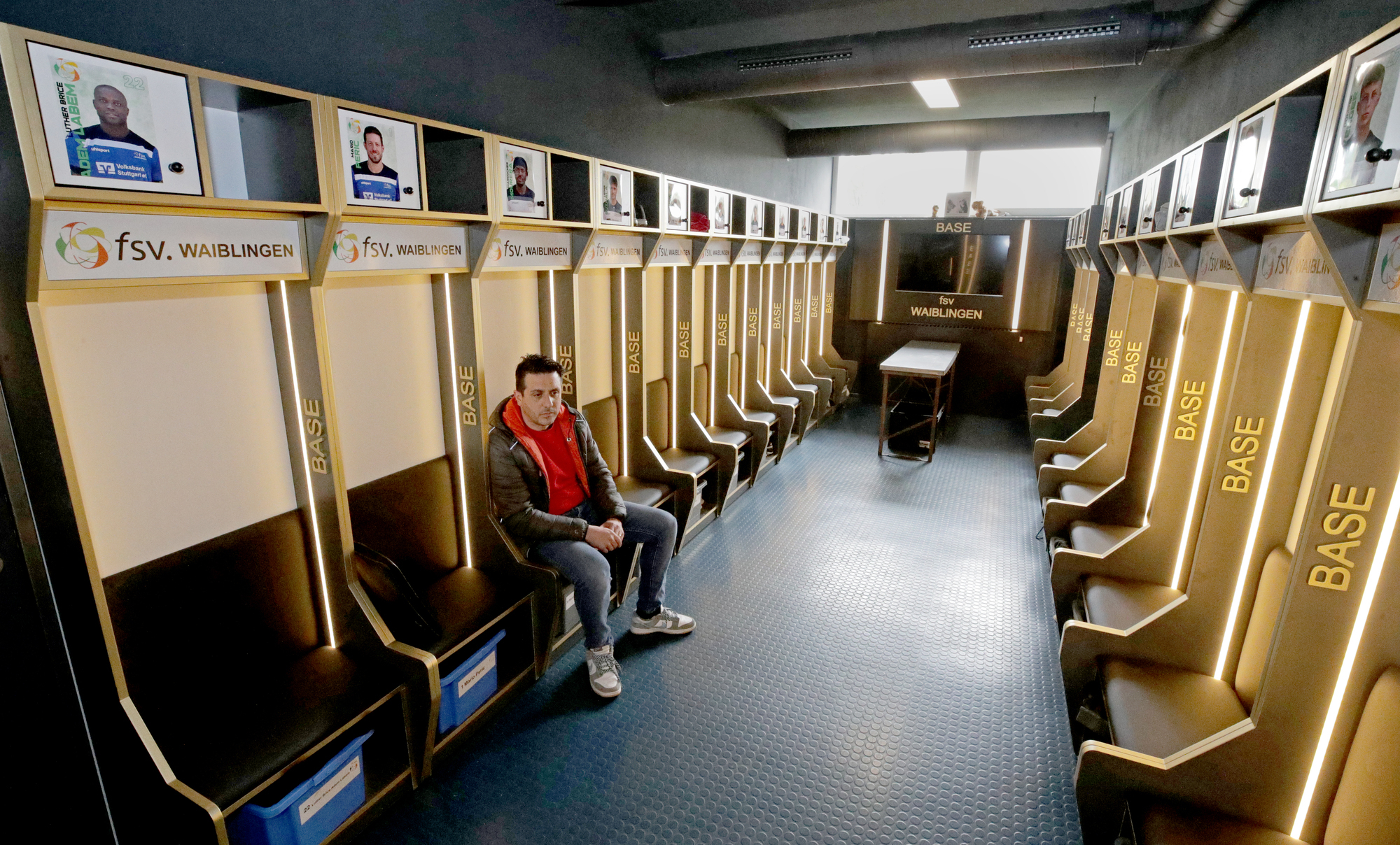 Mit Leder bezogene Polster, schwarze Haken in der Wand, die Fotos der Spieler an den Schränkchen, Kisten mit deren Namen drauf. Dort liegen Fußballschuhe, einer hat seine Regenjacke vergessen. Indirektes Licht sorgt für wohlige Stimmung. Gegenüber der Tür hängt der große Flachbildfernseher, davor steht der Tisch, auf dem am Spieltag Obst, Kaffee und Kuchen stehen. Und überall prangt das Vereinslogo des FSV Waiblingen.