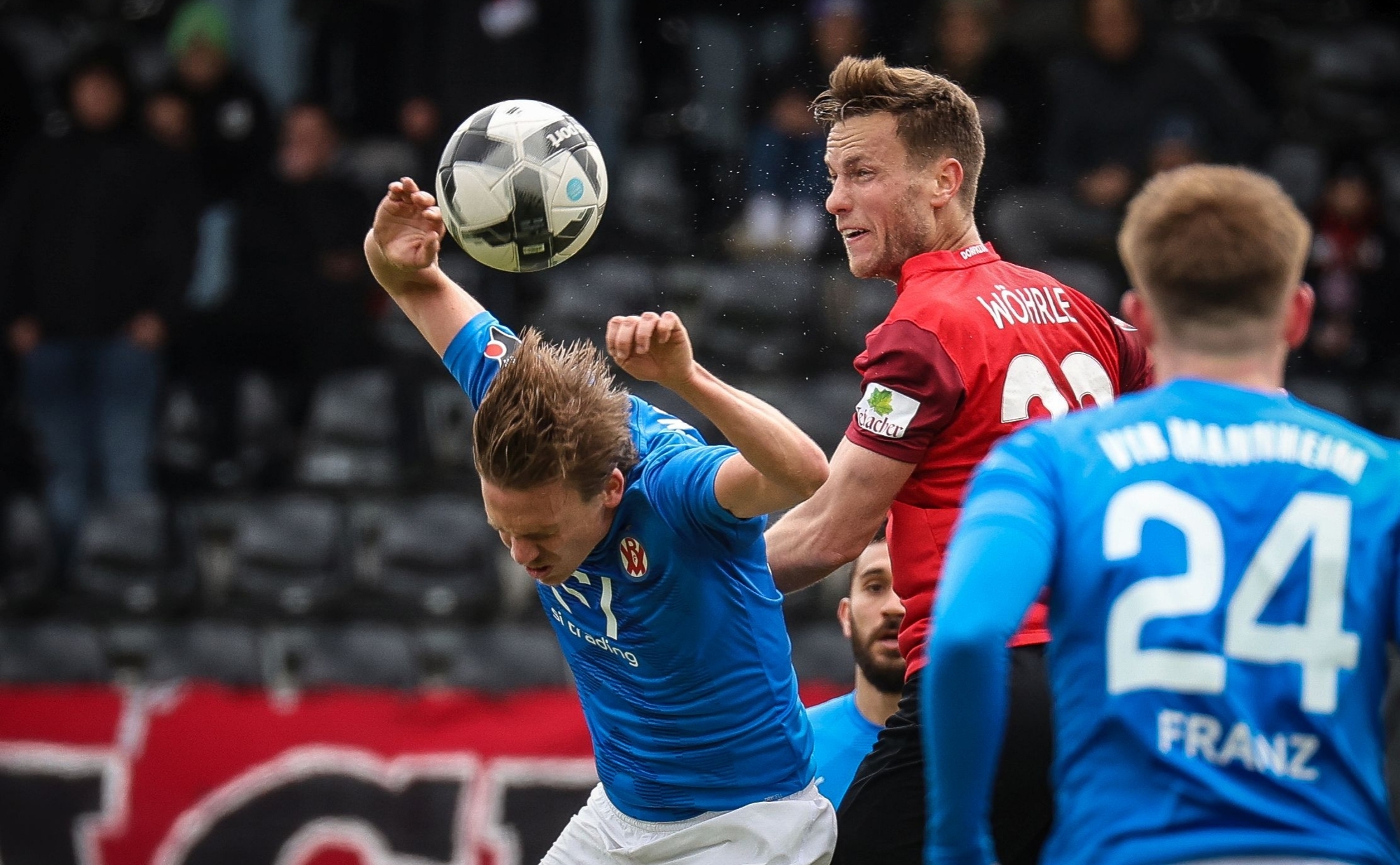 Luca Wöhrle (rotes Trikot) und die SG Sonnenhof Großaspach besiegten den VfR Mannheim mit 2:0 und bleiben mit einem Punkt Rückstand Tabellenzweiter in der Fußball-Oberliga. © Alexander Becher