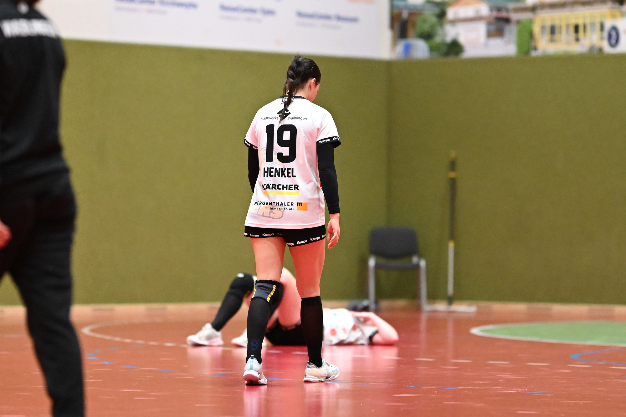 Die Enttäuschung ist nach der erneuten Niederlage gegen Bremen groß: Leonie Henkel und der VfL Waiblingen haben sich die Führung kurz vor Schluss noch nehmen lassen. © Eibner-Pressefoto/Felix Schlikis