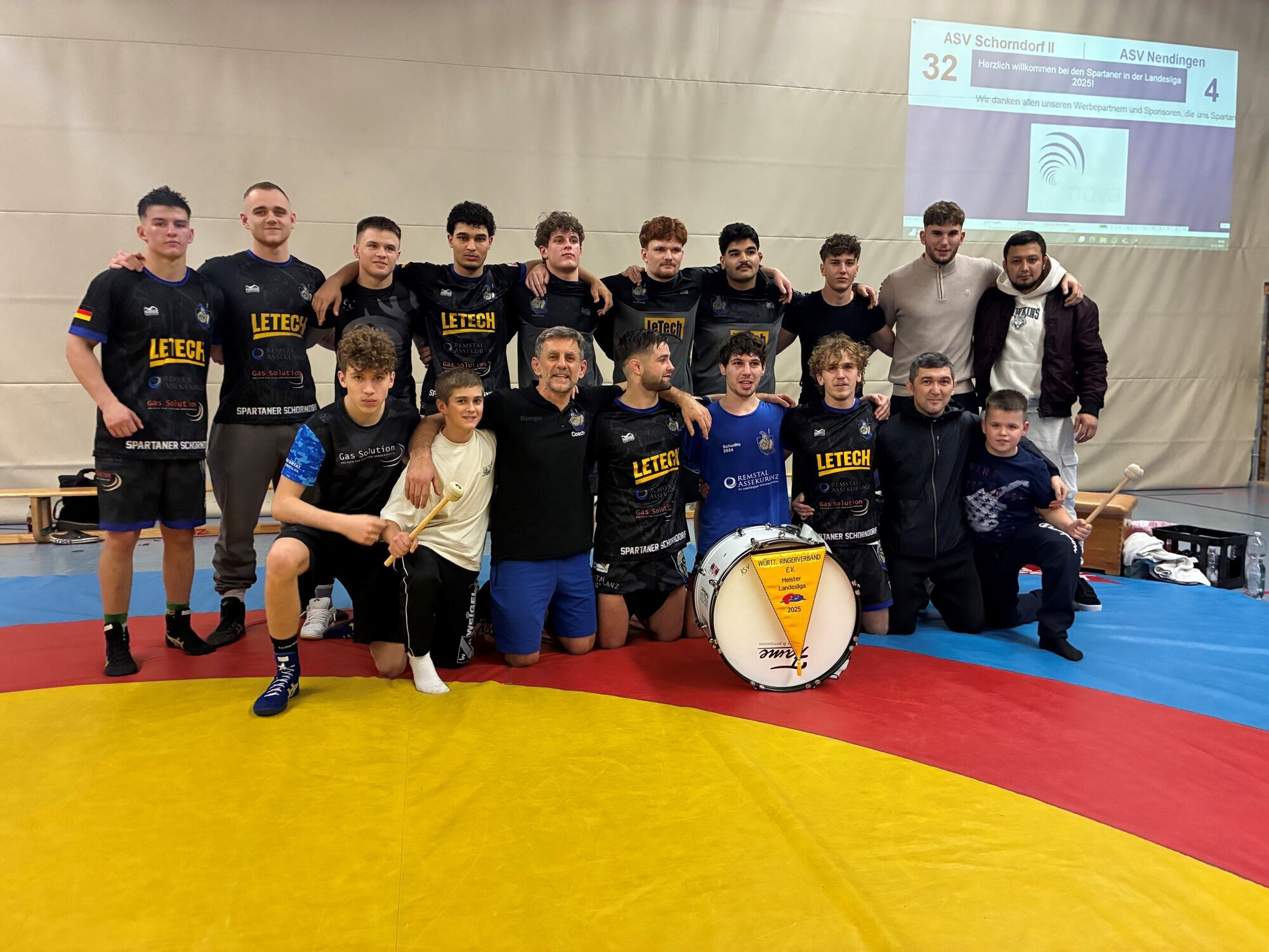 Schorndorf. Die zweite Mannschaft des ASV Schorndorf hat auch im letzten Heimkampf der Landesliga-Saison ein deutliches Ausrufezeichen gesetzt: Mit einem 32:4-Heimsieg gegen den Tabellenzweiten ASV Nendingen bleibt das Team weiter ungeschlagen. Der Gewinn der Meisterschaft und damit verbunden der Aufstieg in die Oberliga stehen schon länger fest und der ASV II wurde dafür nun am Wochenende von WRV-Vizepräsident Günter Prexl mit dem Meisterwimpel geehrt.