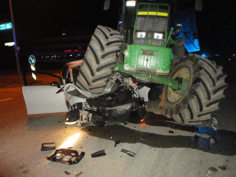 Wie durch ein Wunder hat am Samstag eine 24-Jährige einen Unfall überlebt, bei dem ihr Seat von einem Traktor überrollt wurde. Die Frau hatte am Samstagabend um 17.25 Uhr die Vorfahrt eines Traktors mit Güllefass-Anhänger missachtet. Durch die Wucht des Aufpralls fuhr der Traktor über die Fahrerseite auf den Pkw auf und kam dort mit seinem rechten Vorderrad zum Stehen. Die Seat-Fahrerin wurde bei dem Unfall lediglich leicht verletzt und mit dem Rettungswagen zur Untersuchung in ein Krankenhaus eingeliefert.