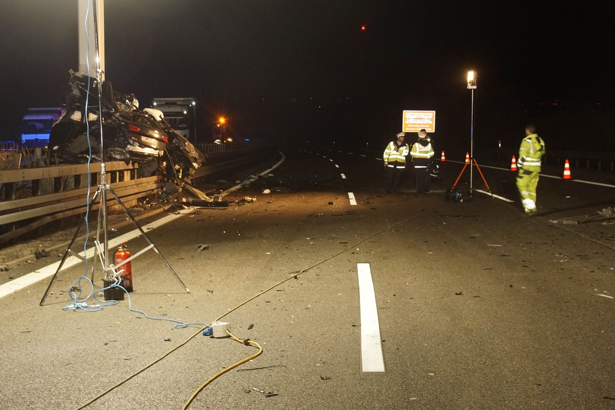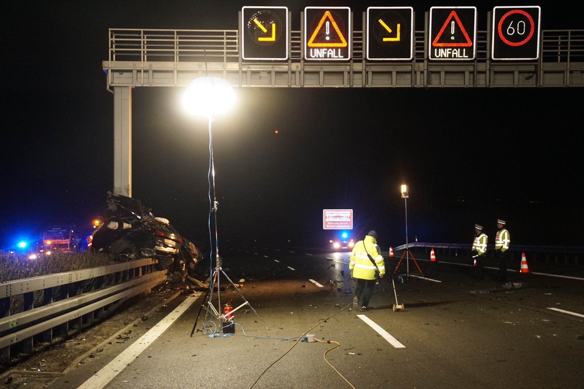Durch die Wucht des Aufpralls wurde der Audi ausgehoben, prallte gegen die Mittelleitplanke und dort gegen den Pfeiler einer Verkehrsbeeinflussungsanlage. Der Autofahrer wurde aus seinem Fahrzeug auf die Richtungsfahrbahn Heilbronn geschleudert und starb noch am Unfallort. Für die weiteren Ermittlungen hat die Polizei auf Anordnung der Staatsanwaltschaft Heilbronn einen Sachverständigen hinzugezogen.