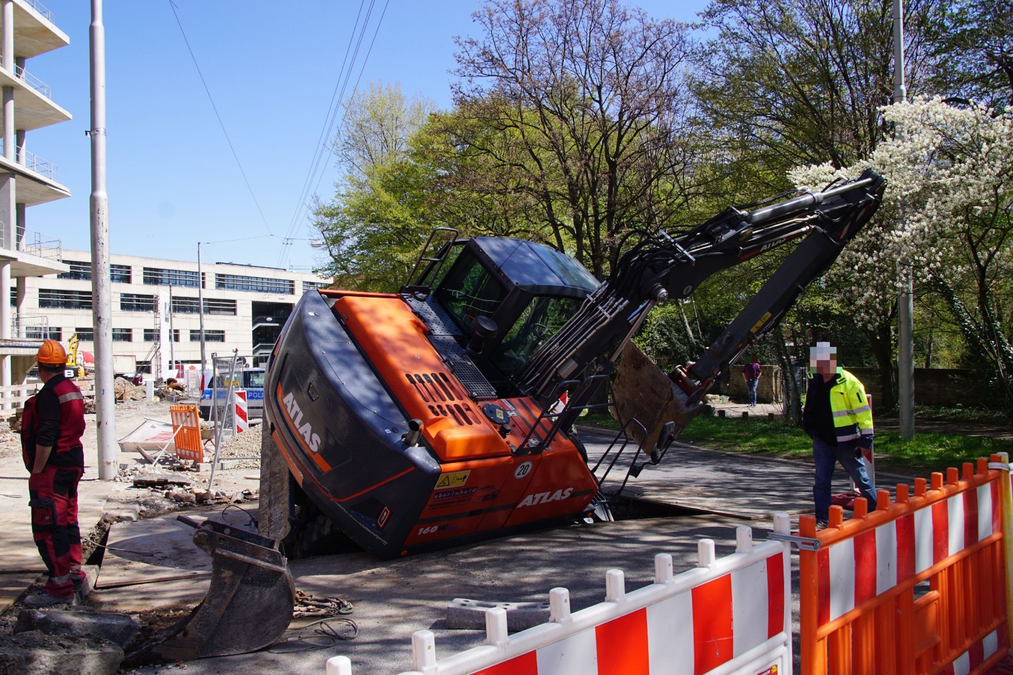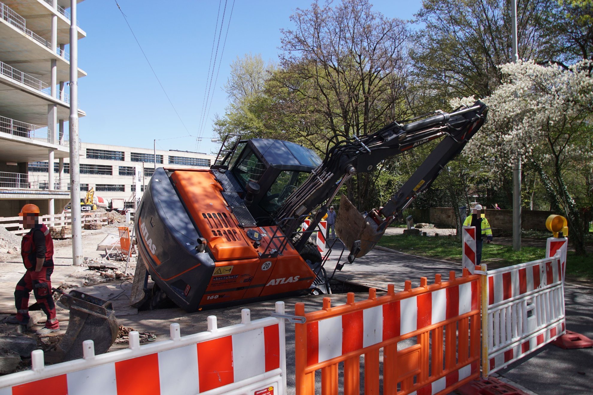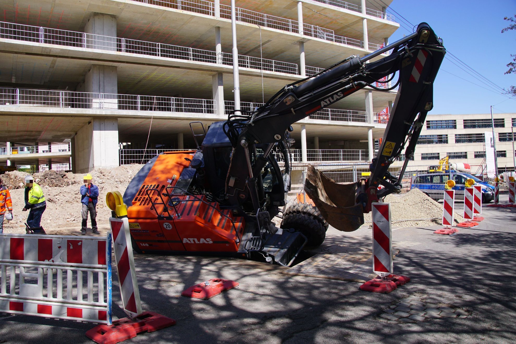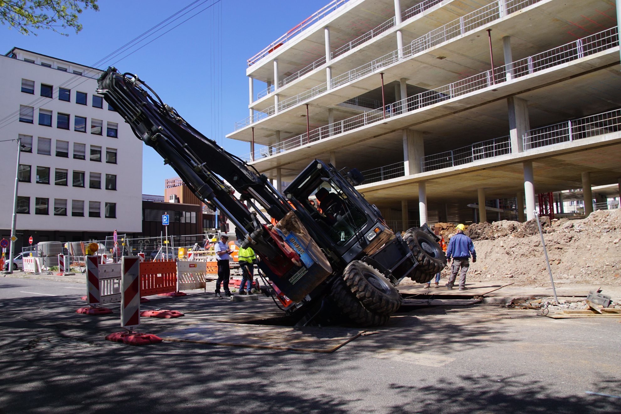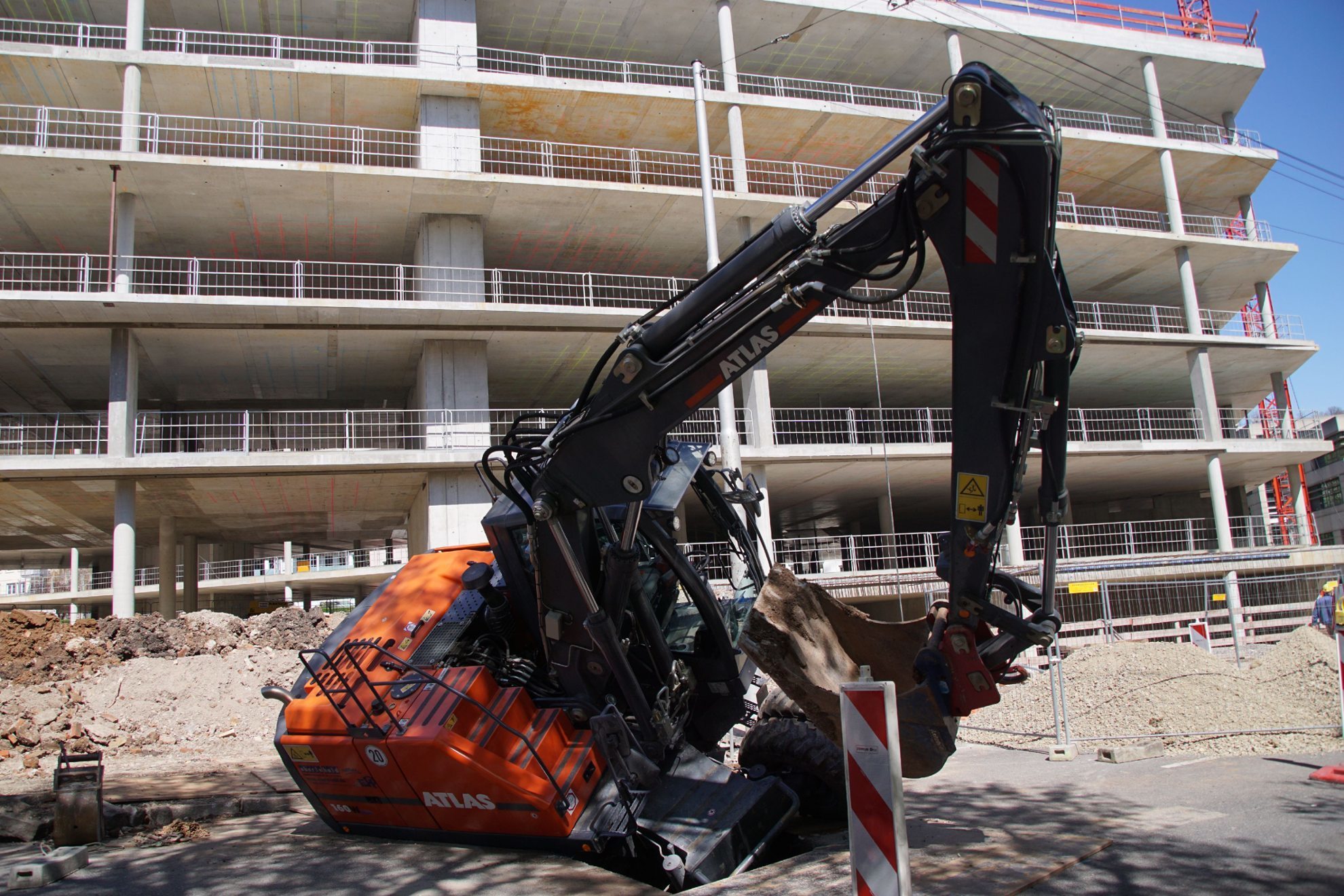 Am Mittwochmittag ist gegen 12:15 ein Bagger auf einer Baustelle in der Rosenbergstraße in eine Baugrube abgerutscht und daraufhin umgekippt. Die Ursache dafür ist zurzeit noch unklar.