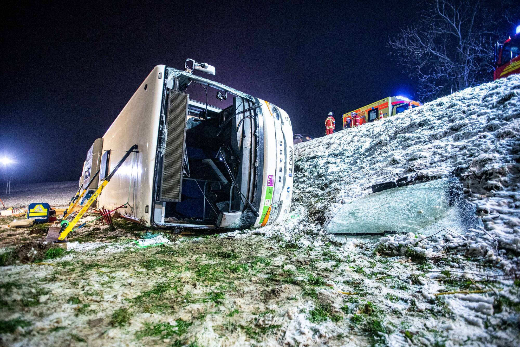In der Folge rutsche der Linienbus den dortigen Abhang hinunter, kippte letztlich auf die Seite. Eine Insassin wurde durch den Unfall im Bus eingeklemmt und musste durch die Feuerwehr befreit werden. Diese erlitt, ebenso wie der 44 Jahre alte Busfahrer sowie zwei weitere Insassen schwere Verletzungen.