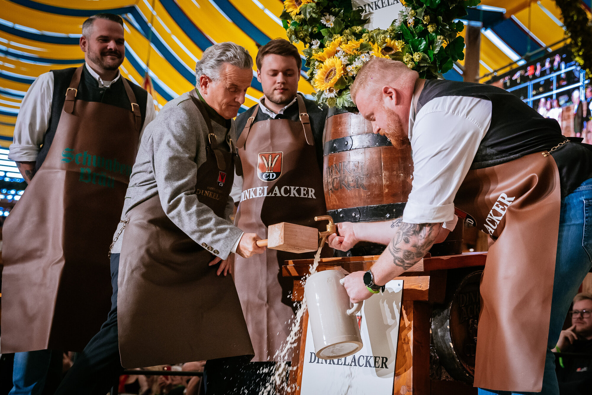 Stuttgart. Stuttgarts Oberbürgermeister Frank Nopper hat an diesem Freitag, dem 26. September, zwei Schläge gebraucht, um das 178. Cannstatter Volksfest zu eröffnen und damit das Bier in allen Zelten sprudeln zu lassen. Damit in keinem Zelt schon vorab Bier aus den Fässern fließt, wird der Fassanstich jedes Jahr per Video in die anderen Zelte übertragen. Nopper brachte auch fünf Volksfestbotschaften mit – in Reimform.