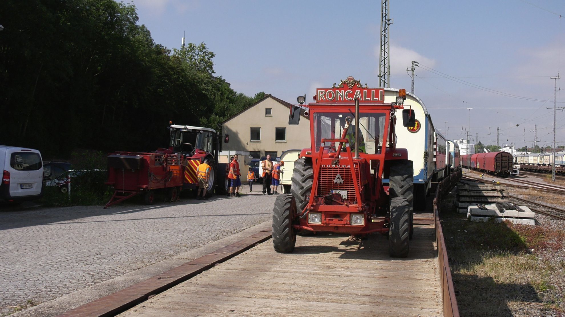 Mit drei Traktoren und zwei modernen Zugmaschinen werden die Wagen gleich nach der Ankunft des Sonderzuges auf den Circusplatz geschleppt. Eine weitere Mannschaft rangiert dort weiter, stellt jeden Wagen an seinen Platz.