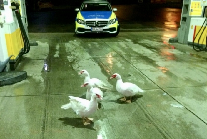 Nachdem ein Fuchs in ihre Behausung eingedrungen war und eine Ente getötet hatte, verließen die vier Enten ihr Gehege und suchten Schutz bei einer nahe gelegenen Tankstelle. Vermutlich in der Hoffnung, dass der Fuchs die Tankstelle nicht aufsuchen wird, machten es sich die Entchen gegen 21 Uhr zwischen den Zapfsäulen gemütlich.