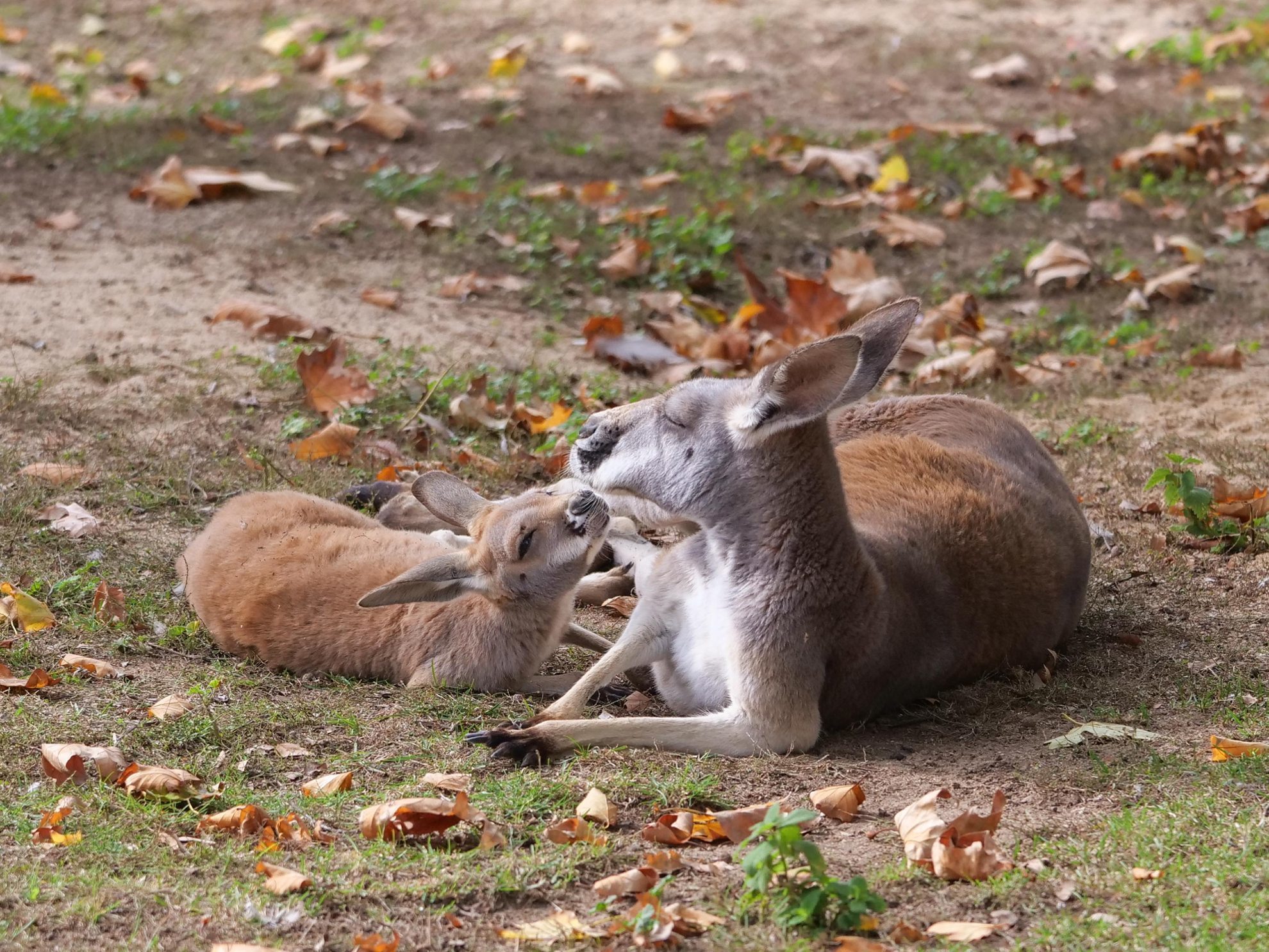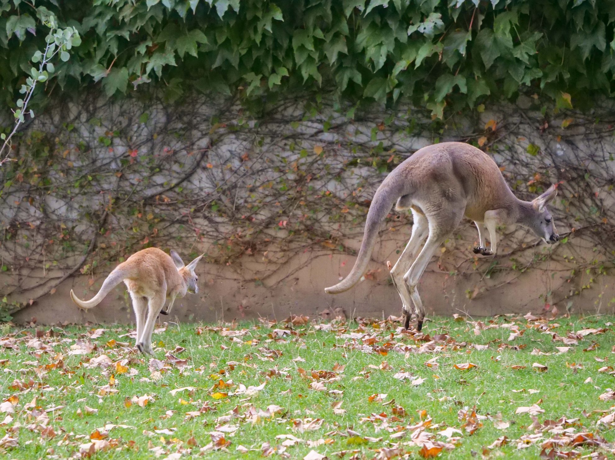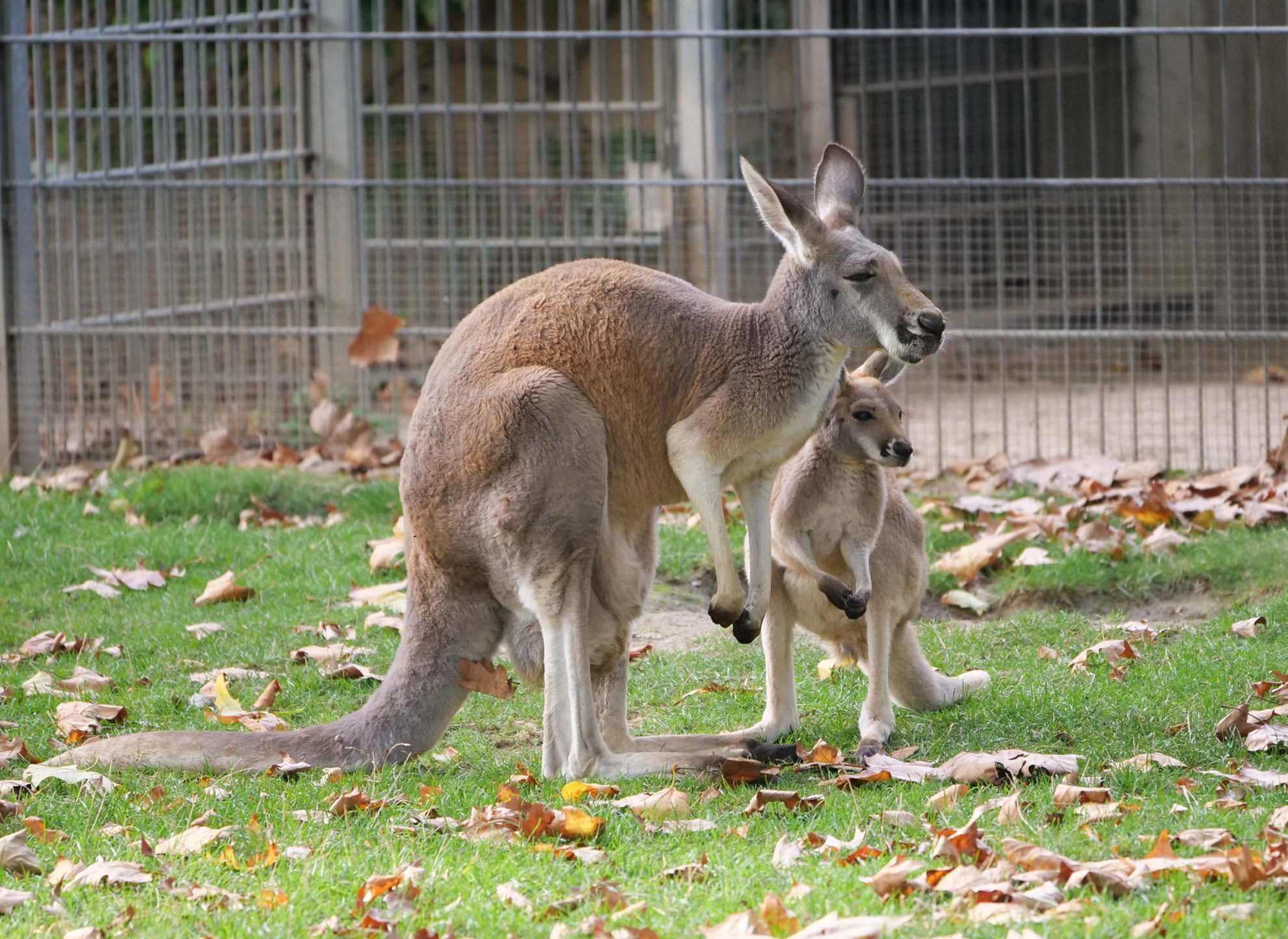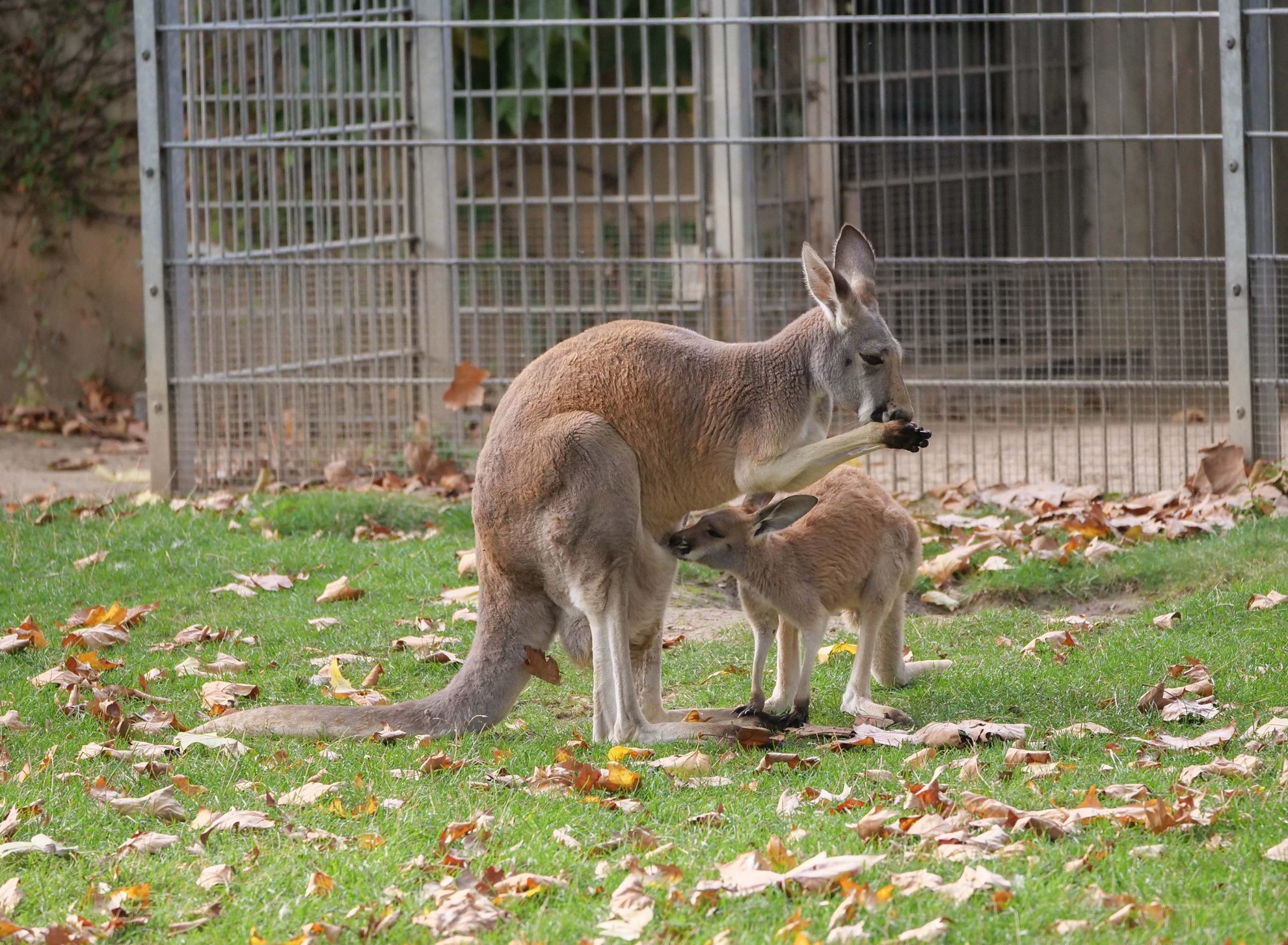 Gut behütet von Mutter Svenja ist das kleine Känguru in den vergangenen Monaten zu einem stattlichen jungen Männchen herangewachsen. Als es im März dieses Jahres zur Welt kam, war es nur so groß wie ein Daumennagel und wog gerade einmal ein Gramm. Die Geburt erfolgt bei den australischen Riesenkängurus meist ganz unbemerkt. Dass Känguruweibchen Svenja ihr erstes Jungtier bekommen hatte, war daher zunächst nur an dem wachsenden Umfang ihres Beutels zu erkennen. Darin versteckt – und damit direkt an der Milchquelle – verbrachte das Neugeborene die Anfangszeit, bevor es im August schließlich die ersten neugierigen Blicke nach draußen warf. Anfang Oktober folgte dann der nächste große Schritt in die Selbstständigkeit: Immer wieder verließ das Kängurukind für kleine Abstecher die kuschelige Mutterstube.