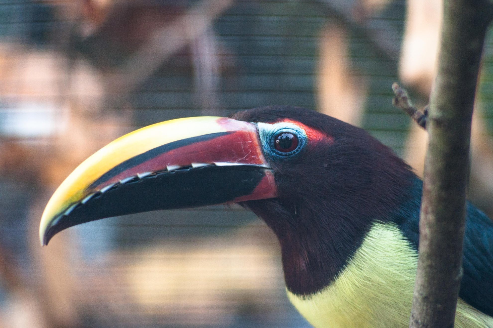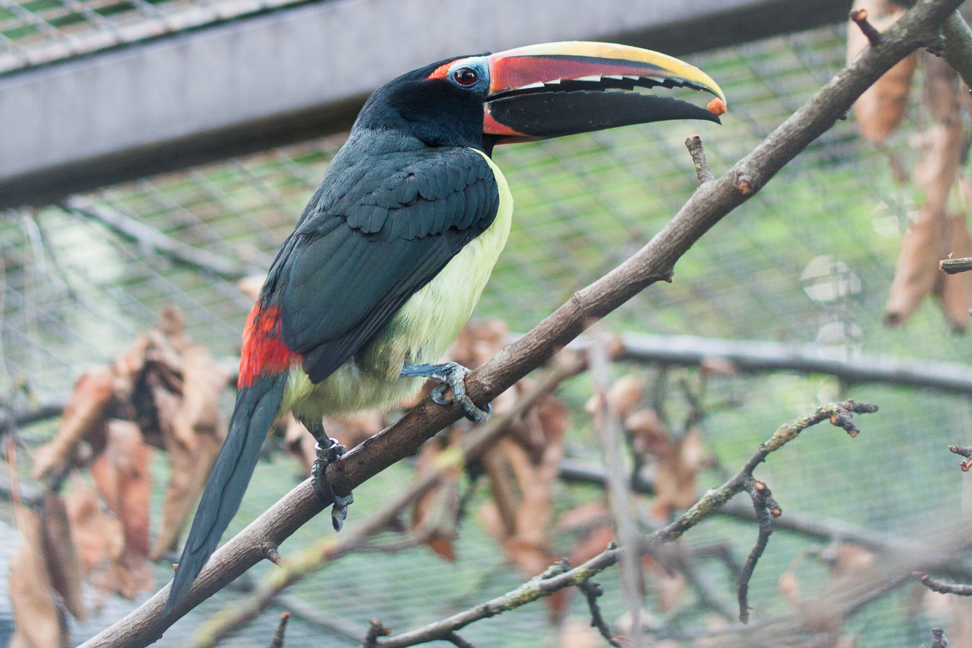 Dafür kommt das auffälligste Merkmal dieser kleinen Tukanart im Kontrast zum dunklen Gefieder besonders gut zur Geltung: Der große, bunt gestreifte Schnabel. Dieser ist trotz seiner massiven Optik ein Leichtgewicht. „Das Knochengeflecht des Schnabels enthält Luftkammern. Er ist zwar stabil, aber eigentlich nicht schwer“, sagt Schwab. „Nur das Fressen ist etwas umständlich. Die Vögel müssen das Futter mit der Spitze aufnehmen, nach hinten werfen und mit dem geöffneten Schnabel auffangen.“ Auch beim Nestbau ist der Schnabel nicht unbedingt praktisch. Obwohl die Arassaris zu den Spechtvögeln gehören, mühen sie sich in der Regel nicht selbst mit der Bearbeitung hartnäckiger Baumrinde ab.