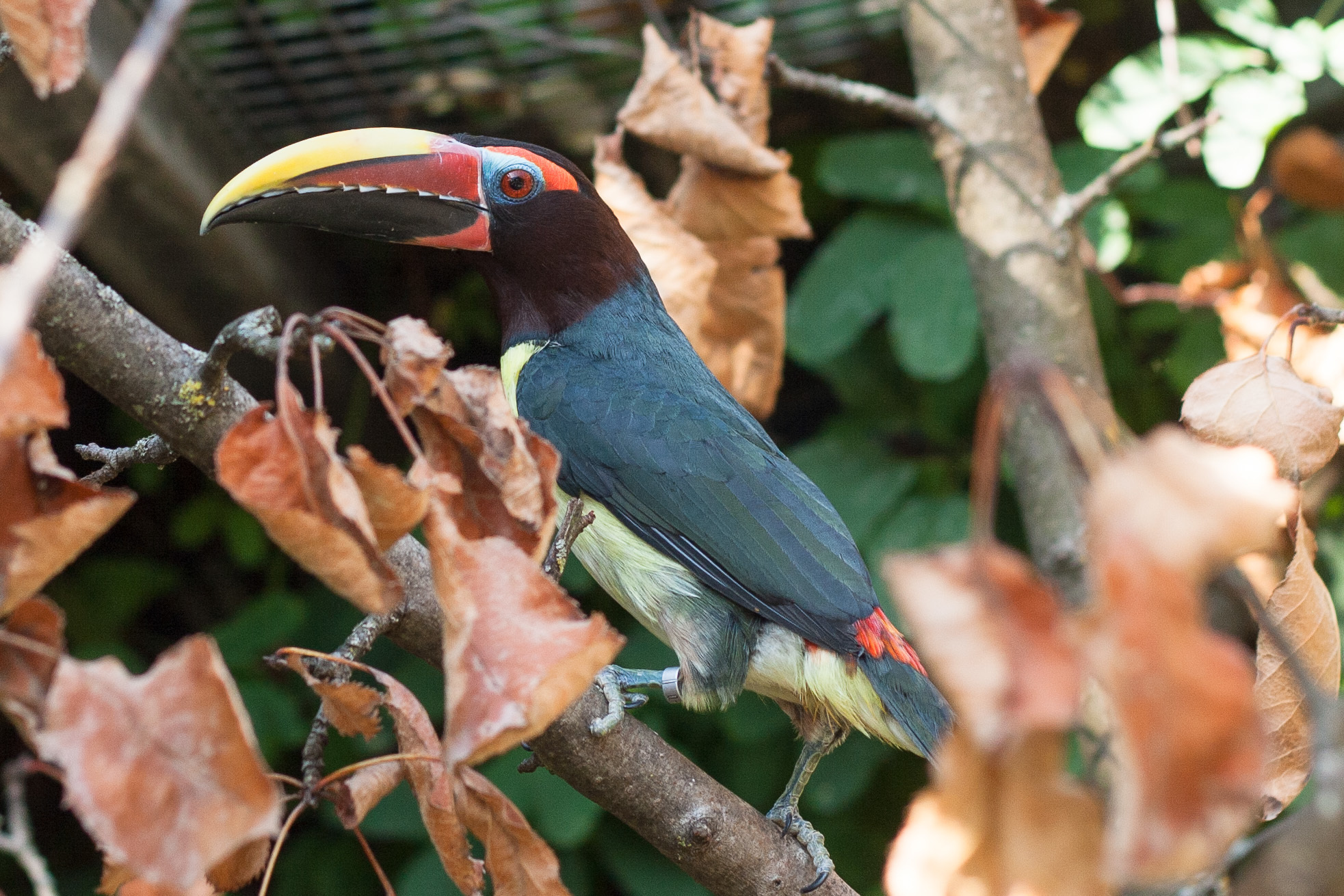 Wer bei diesem klangvollen Namen nun ein glänzendes Gefieder in leuchtendem Grün erwartet, wird beim ersten Blick auf die Tropenvögel stutzen. Die Grünarassaris werden der Gattung der Schwarzarassaris zugeordnet und kleiden sich in dunkles Anthrazit. Leicht grünlich schimmern im warmen Herbstlicht nur die Weibchen, deren Köpfe zudem rotbraun gefärbt sind. Dabei sind kräftige Nuancen in ihrer Heimat, den tropischen Wäldern Südamerikas, eigentlich ein großer Vorteil, denn sie tragen zur Tarnung bei.
