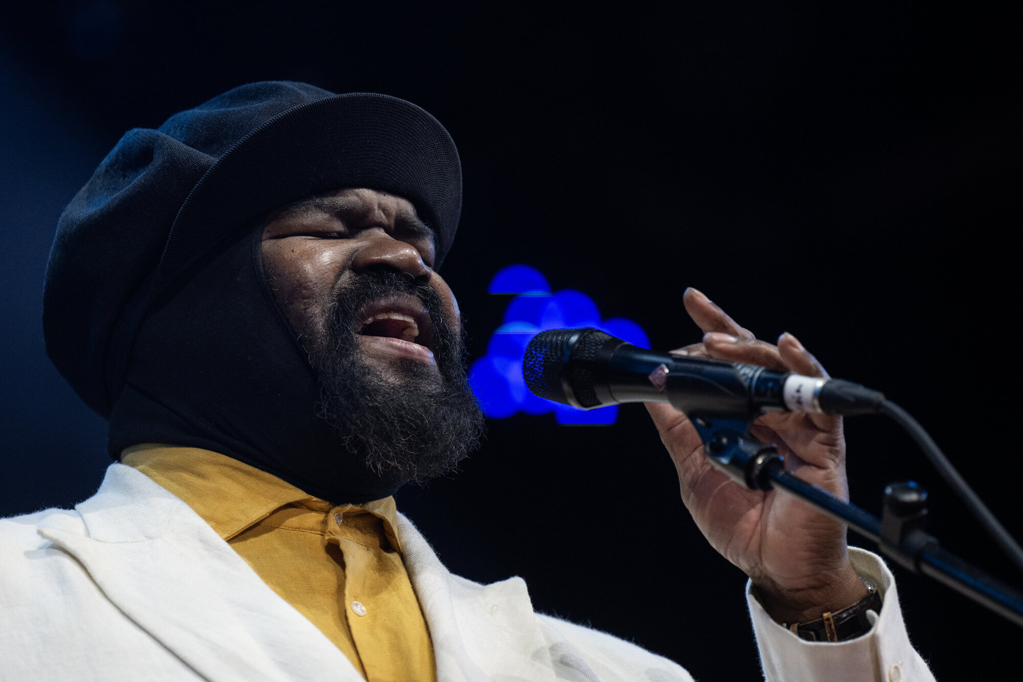 Gegen 20.23 Uhr war es so weit: Nachdem die Vorband Larceny das Publikum mit feinen Jazz-Klängen auf den Hauptact des Abends einstimmen konnte, betrat Gregory Porter die Bühne im Innenhof des Alten Schlosses. Das imposante Gebäude, das vierhundert Jahre lang die Residenz der Grafen und Herzöge von Württemberg und damit das Machtzentrum des Landes war, sollte im Laufe des Abends Schauplatz eines beeindruckenden Konzerts werden. Gregory Porter, der sich gewohnt nobel in einem (diesmal weißen) Anzug und seiner dunklen Ballonmütze über einem Schlauchschal (sein Markenzeichen) präsentierte, sagte in Anspielung auf das imposante Schloss mit einem Schmunzeln: „I am in the kingdom of this festival“.