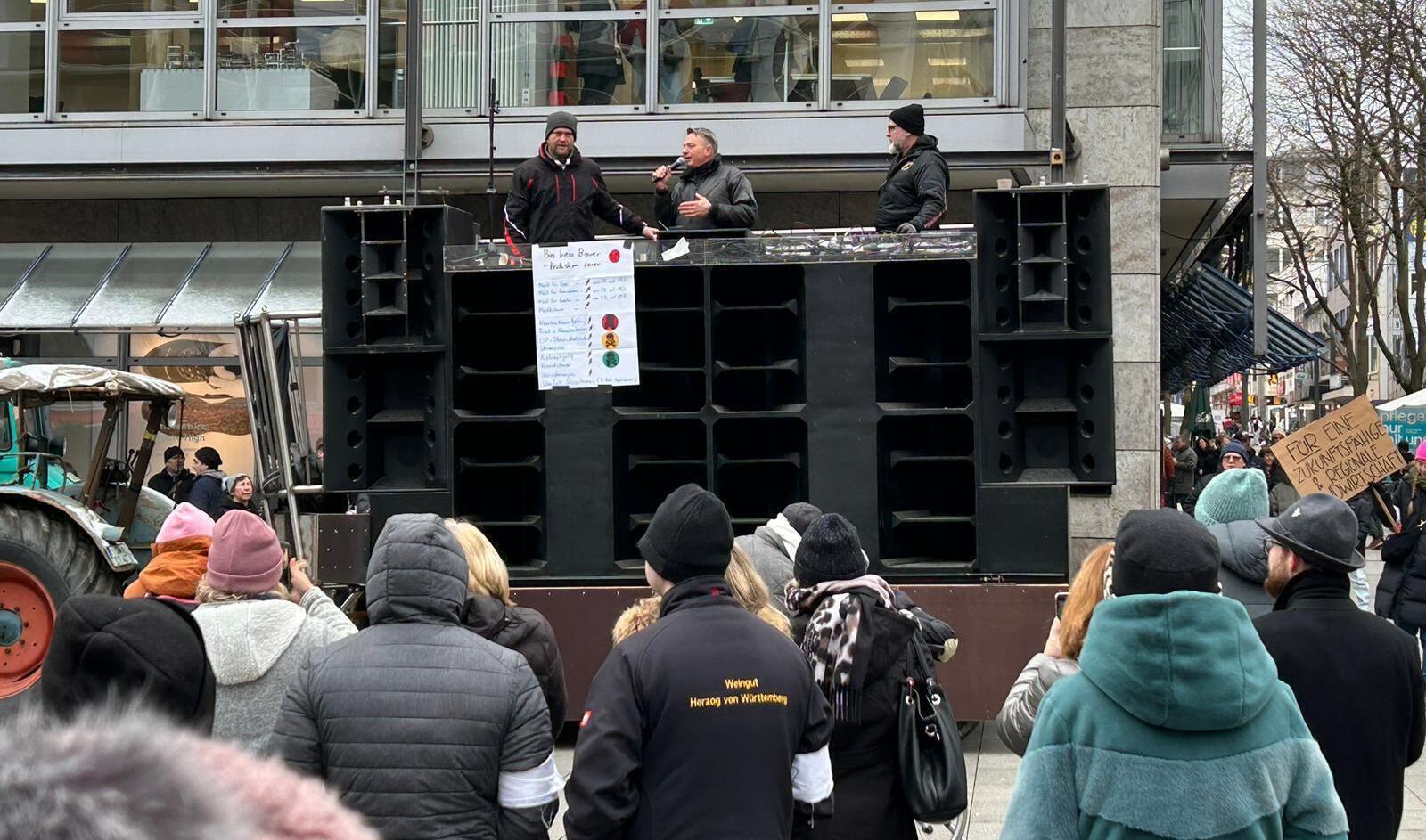 Gegen 10.30 Uhr beschallte am Montagvormittag laute Musik den Rotebühlplatz im Herzen Stuttgarts. Gegen 11 Uhr rollten dann wie geplant die ersten Traktoren ein – unter Jubel der mehreren hundert Demo-Teilnehmer, die sich bis dahin dort versammelt hatten. Auch zahlreiche Lkws und Transporter von Handwerksbetrieben beteiligten sich am Demonstrationszug. Insgesamt 500 Fahrzeuge seien es gewesen, die sich am Morgen auf dem Cannstatter Wasen gesammelt hatten, sagte Winzer Michael Warth aus Untertürkheim. Nur ein Teil davon fuhr mit zur Kundgebung in der Stadtmitte. Michael Warth hatte die Demo initiiert, sein Namensvetter Klaus Warth, ebenfalls Winzer in Untertürkheim, hatte sie bei der Stadt angemeldet.