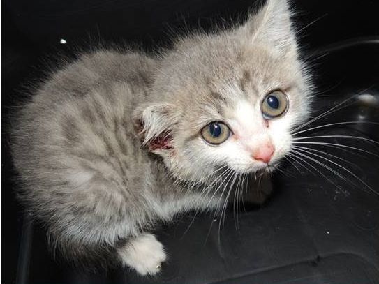 Mit abgeschnittenem Ohr und Hämatomen am Rücken wurde ein vier Wochen altes Katzenbaby gefunden. © Anne-Katrin Walz