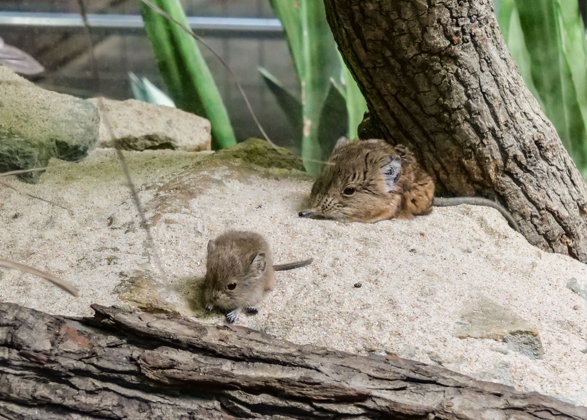 Im Giraffenhaus der Wilhelma gibt es aktuell einen Wettkampf der Neulinge um die Gunst des Publikums. Hoch im Kurs stehen die vor kurzem eingezogenen Fenneks. Ihre im Verhältnis zum kleinen Körper riesigen Ohren lassen sie äußerst putzig aussehen. Doch haben die Wüstenfüchse jetzt Konkurrenz bekommen vom Nachwuchs bei noch kleineren Sandflitzern. Das Kontrastprogramm liefern die Kurzohrrüsselspringer. Wie der Name verrät, fallen bei ihnen die Ohren klein aus. Dafür ist ihre relativ lange bewegliche Nase sehr markant. Bei den beiden am 23. April geborenen zwei Jungtieren wirkt das besonders niedlich.