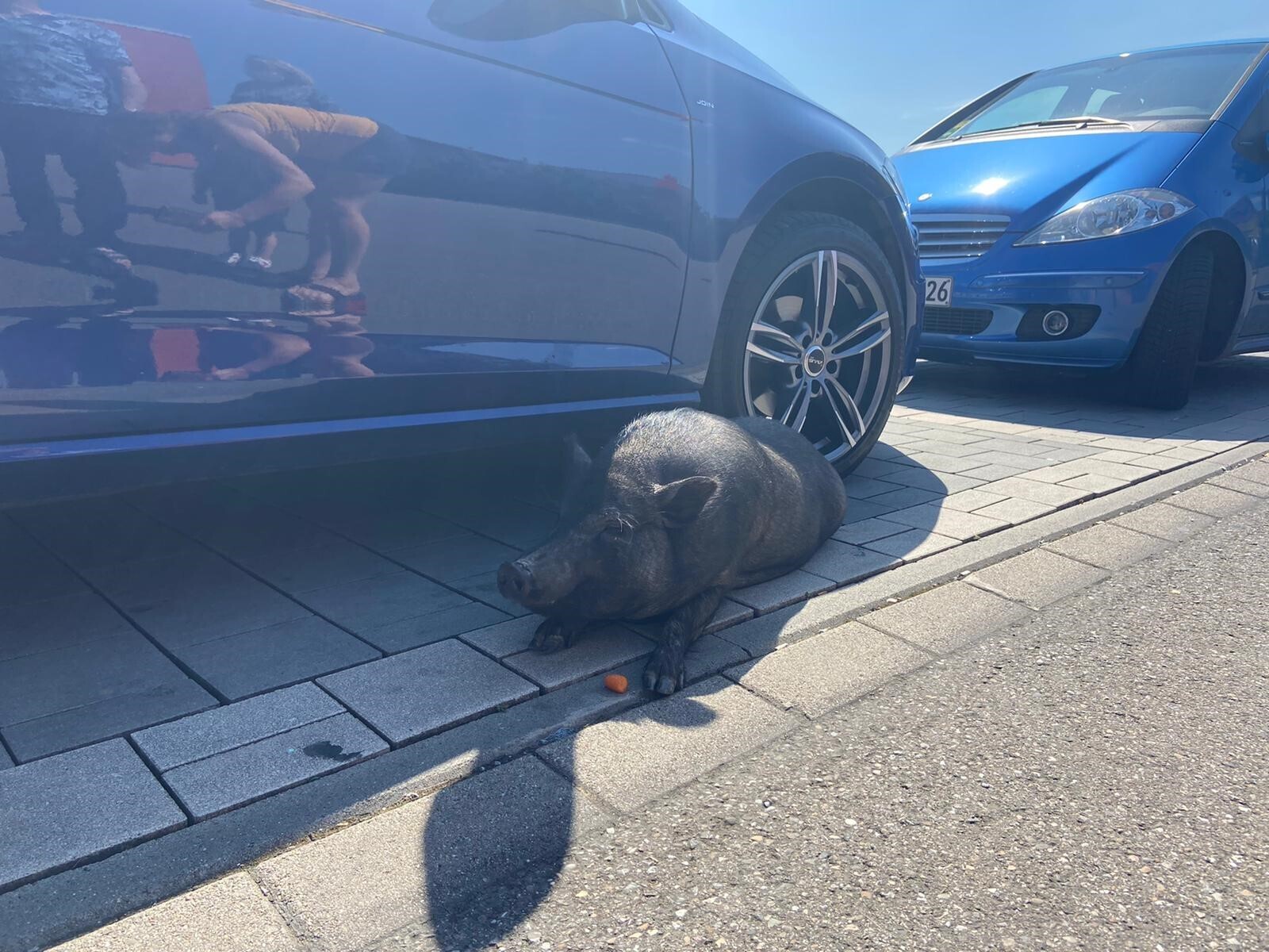 Am Donnerstagmittag (23.07.) wurde die Polizei zu einem ungewöhnlichen Einsatz gerufen: In Affalterbach ist ein Schwein aus seinem Zuhause ausgebüxt. Das Tier spazierte erst durch eine Bäckerei, ehe es sich mit einer Karotte auf einem Parkplatz im Schatten ausruhte. Nach dem kurzen Spaziergang wurde das entlaufene Schwein von seinem Besitzer abgeholt und sicher nach Hause gebracht.