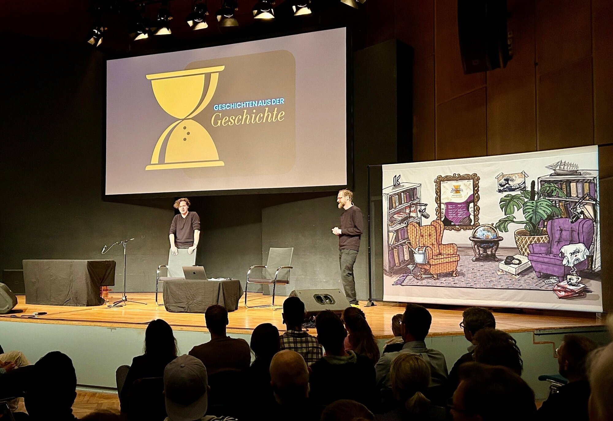 Stuttgart, Mozartsaal, ein Dienstagabend Anfang Oktober. 790 Menschen haben sich eingefunden, um zwei Historikern zuzuhören. Kein Kammerkonzert, kein Chopin, kein Starpianist. Sondern Daniel Meßner und Richard Hemmer, zwei Studienfreunde aus Wien, die mit schwarzen Pullovern, einem schüchternen Lächeln und einem unverwechselbaren Intro die Bühne betreten: „Lernen’S ein bissl Geschichte und dann werden Sie sehen, Herr Reporter, wie sich das damals entwickelt hat“, dröhnt der ehemalige österreichische Bundeskanzler Bruno Kreisky aus den Boxen. Der Saal lacht – und weiß: Die Zeitreise beginnt. Wieder einmal.