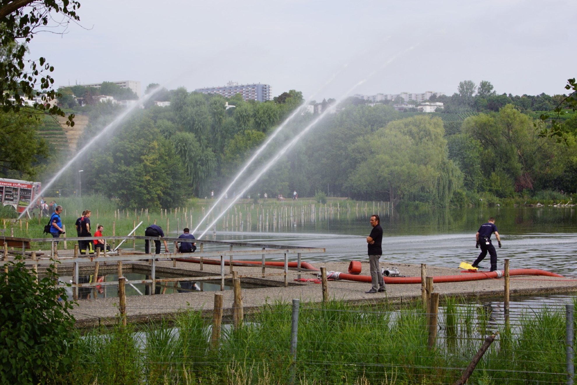 Seit Donnerstag Vormittag war die Feuerwehr mit knapp 30 Einsatzkräften vor Ort, um das Seewasser umzuwälzen, teilt die Stadt Stuttgart mit. Dabei wird dem See mit Pumpen Wasser entnommen und dann wieder in den See gegeben. Das Wasser wird entweder hoch in die Luft gespritzt, so dass es als Regen auf die Oberfläche auftrifft, oder als Strahl in den See gebracht, so dass möglichst viel Luftsauerstoff hinzukommt. Zudem wird dem See frisches Quellwasser zugeführt.