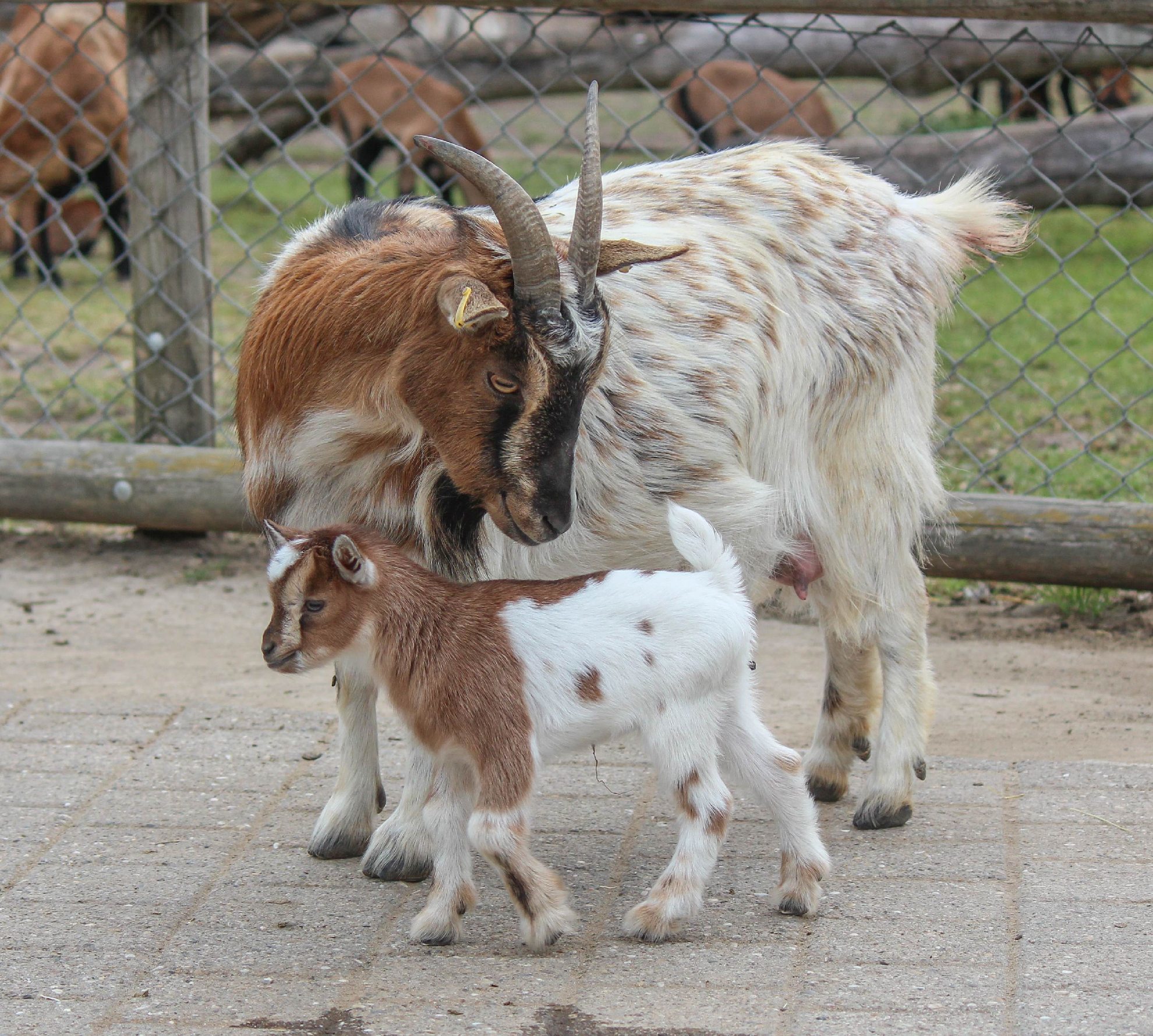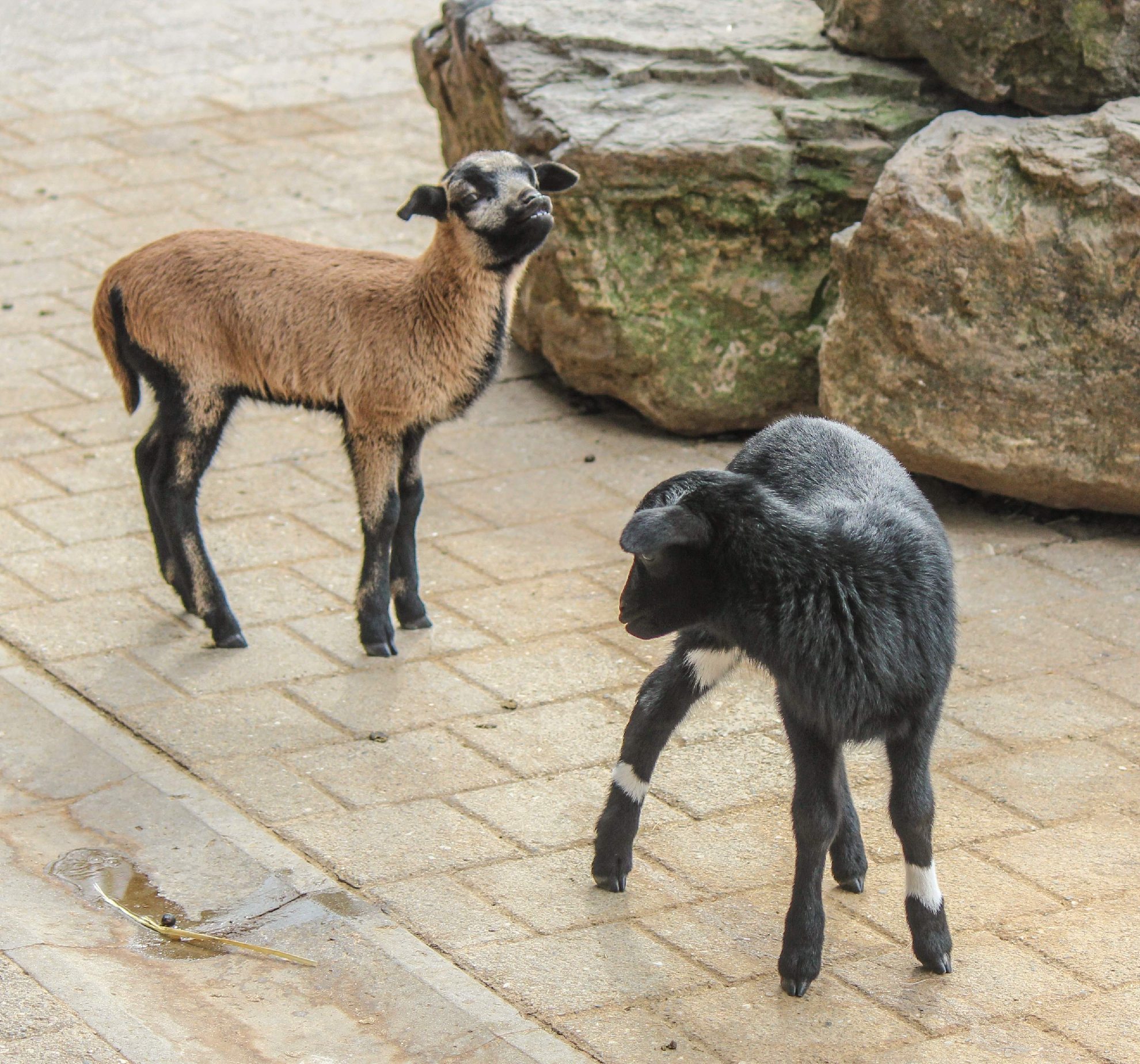 Unter den neun Lämmern der Kamerunschafe ist erstmals in der Wilhelma auch ein schwarzes – eine echte Laune der Natur, denn das zweite Lamm der Zwillingsgeburt hat die typische braune Fellfarbe. Bei Skudden ist das dagegen nicht selten. Hier sind unter den zwölf Lämmern sowohl schwarze als auch weiße. Und bei den Zwergziegen sind die zehn Zicklein farblich gemischt und manches trägt auch eine bunt gescheckte Haartracht. Bei den Schwäbisch-Hällischen Schweinen gehört es zur Besonderheit, dass jeweils Kopf und Hinterteil der ansonsten rosigen Tiere schwarz sind. Bei der bedrohten Nutztierrasse hat die Sau Lucy elf Ferkel zur Welt gebracht. Und Arielle ist trächtig. Bei ihr erwarten die Pfleger den Nachwuchs Ende April oder Anfang Mai. Nur die dritte im Bunde, Amina, hat der Zuchteber Porsche noch nicht beglückt.