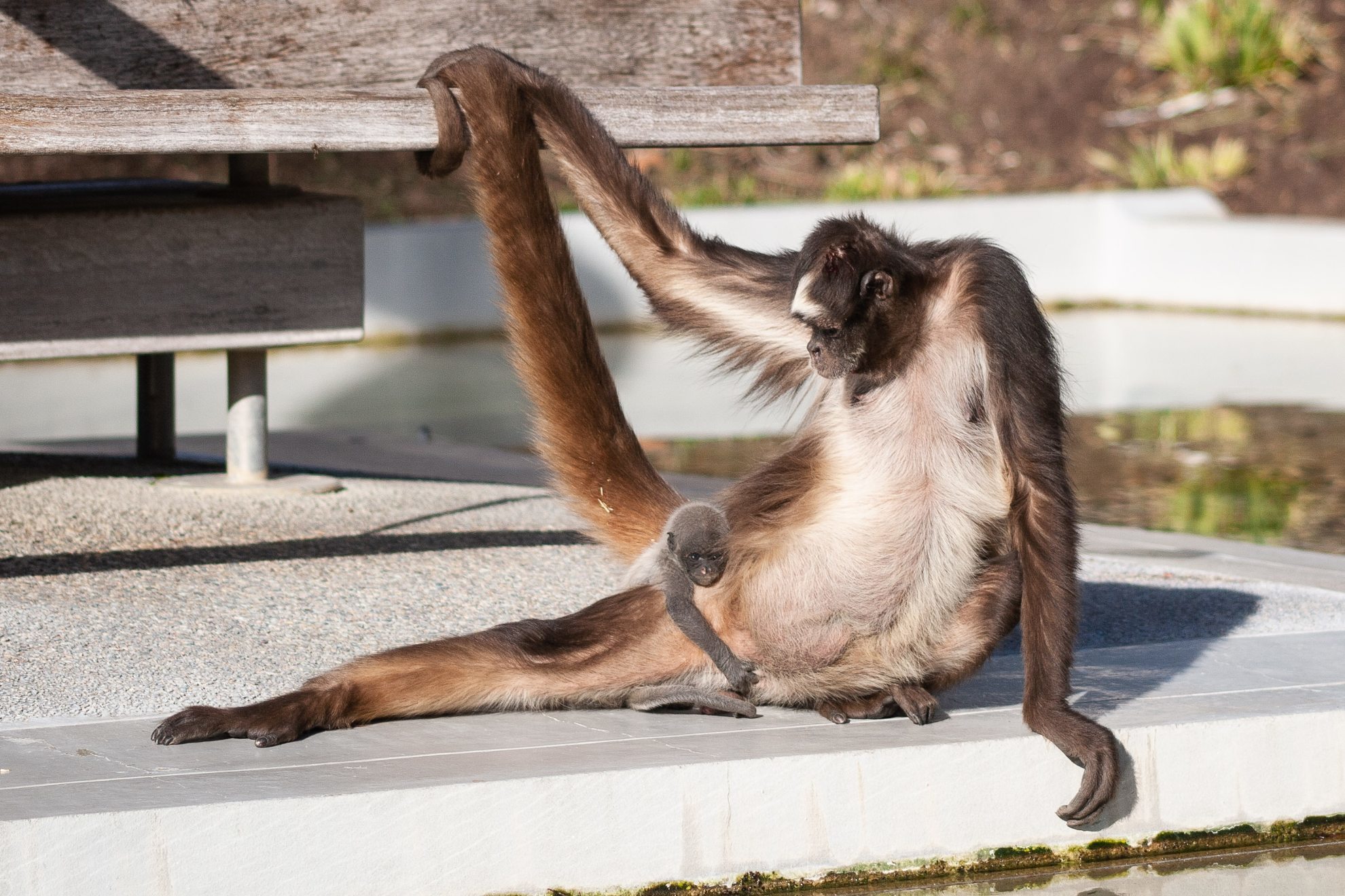Goldstirn-Klammeraffen kommen ursprünglich aus den tropischen Regenwäldern Kolumbiens und Venezuelas. Ihr Daumen, der beim Hangeln eher stört als nützt, ist bei den Klammeraffen stark zurückgebildet. Stattdessen nutzen sie zum Klettern und Balancieren ihren Schwanz wie eine zusätzliche Hand. Auch bei Tolga kann man das schon beobachten. Wie Tierpflegerin Thali Bauer erklärt, wickelt er seinen Schwanz aber noch als Absturzsicherung um den Schwanz seiner Mutter. Klammeraffenmütter lassen sich häufig nur am Schwanz von Ästen baumeln. „So haben sie die Hände frei, können sich um ihr Jungtier kümmern und gleichzeitig fressen.“