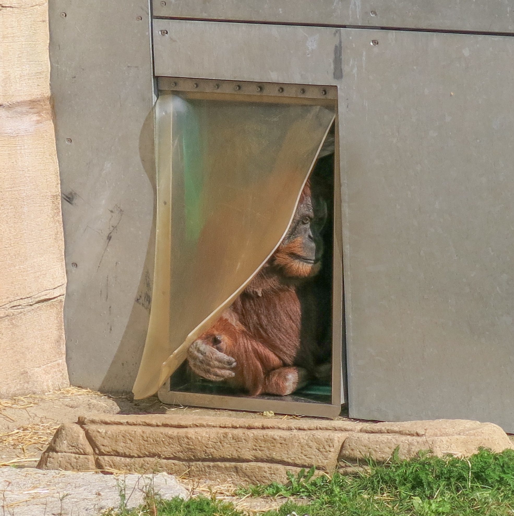 Derweil sind sie bei den Gorillas gut untergekommen. Denn deren Anlage verfügt über zwei Innen- und zwei Außengehege – für den Fall, dass der Silberrücken aufs Altenteil gesetzt werden muss oder ein älterer Sohn vom Vater nicht mehr geduldet wird und abzutrennen ist. Haremschef Kibo ist jedoch im besten Alter und sein ältester Sohn Kimbali wird in absehbarer Zeit an einen anderen Zoo gehen. Da kein Ärger ins Haus steht, kann die Gorillasippe in den ausreichend dimensionierten Gehegen etwas zusammenrücken und so nebenan Platz für die beiden Orang-Damen machen.