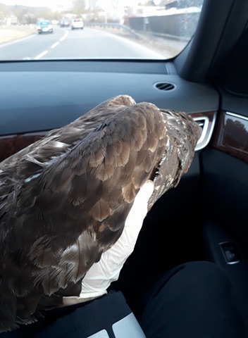 Als einer der Beamten den Raubvogel am Fahrbahnrand ablegen wollte, stellte er erstaunt fest, dass der Vogel noch am Leben war. Kurzerhand nahm der Polizist den Bussard auf den Arm und mit in den Streifenwagen. Die wohl erste und vermutlich auch einzige Fahrt des Tieres in einem Streifenwagen führte ihn direkt in die Wildvogel-Auffangstation in Westhausen.